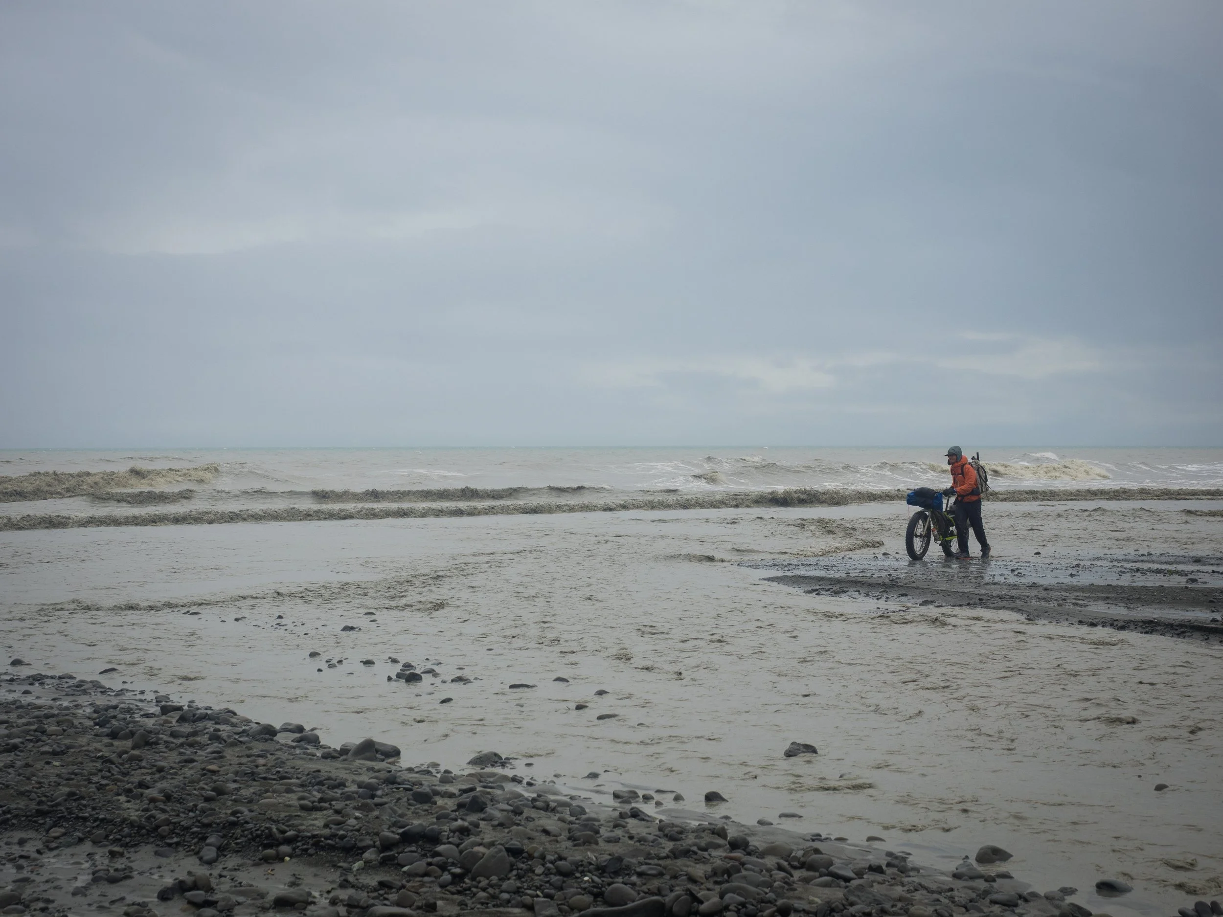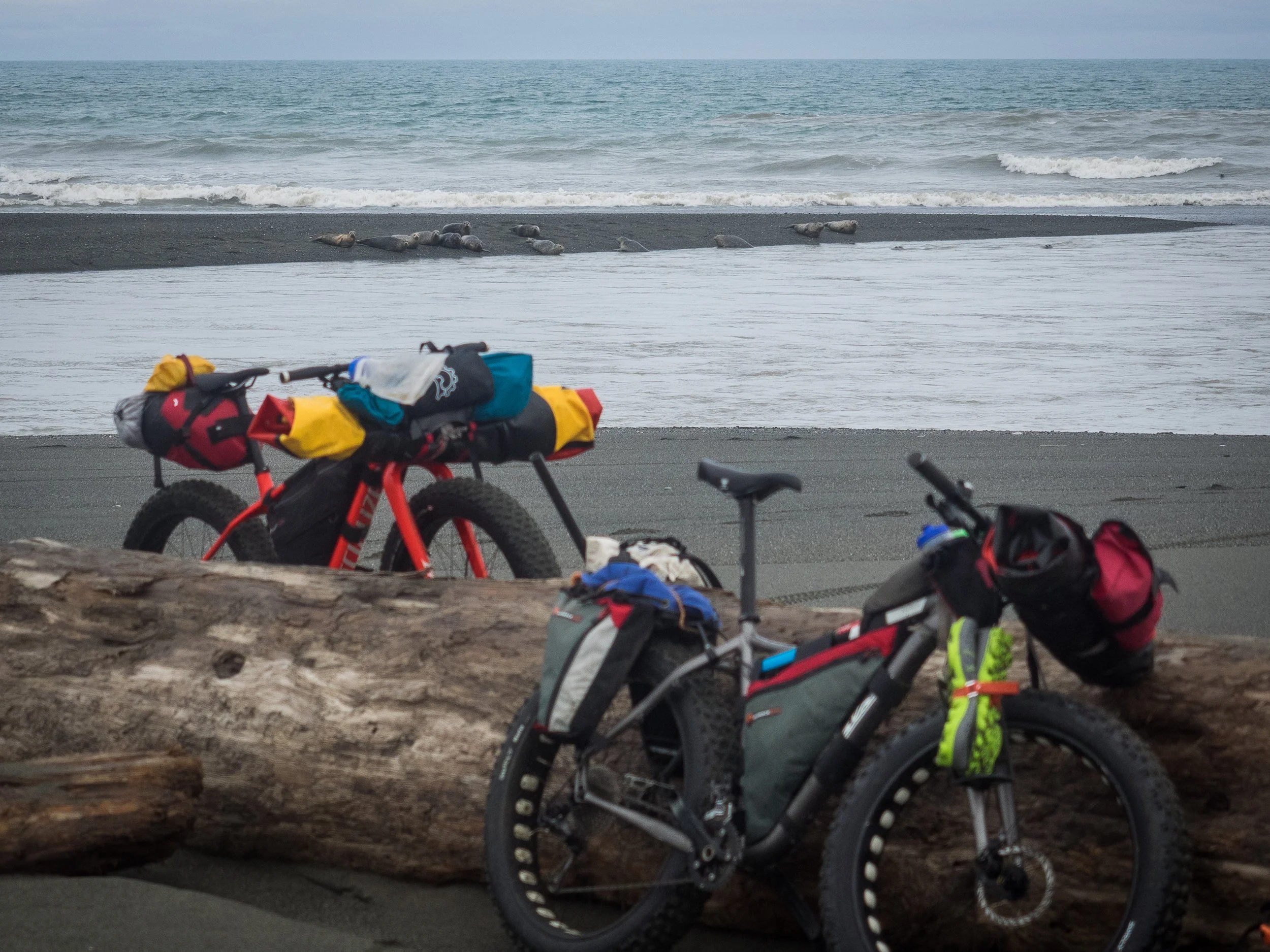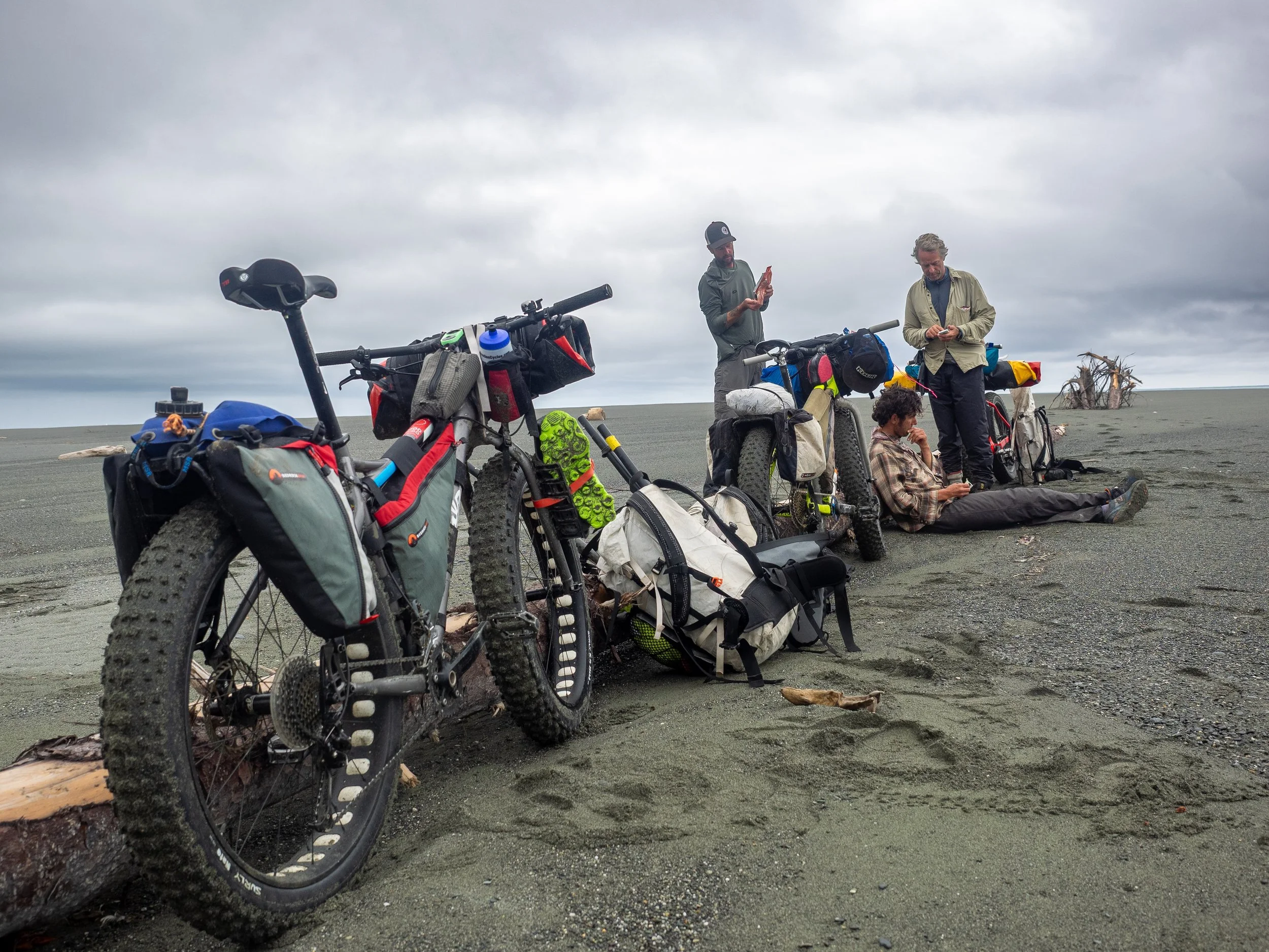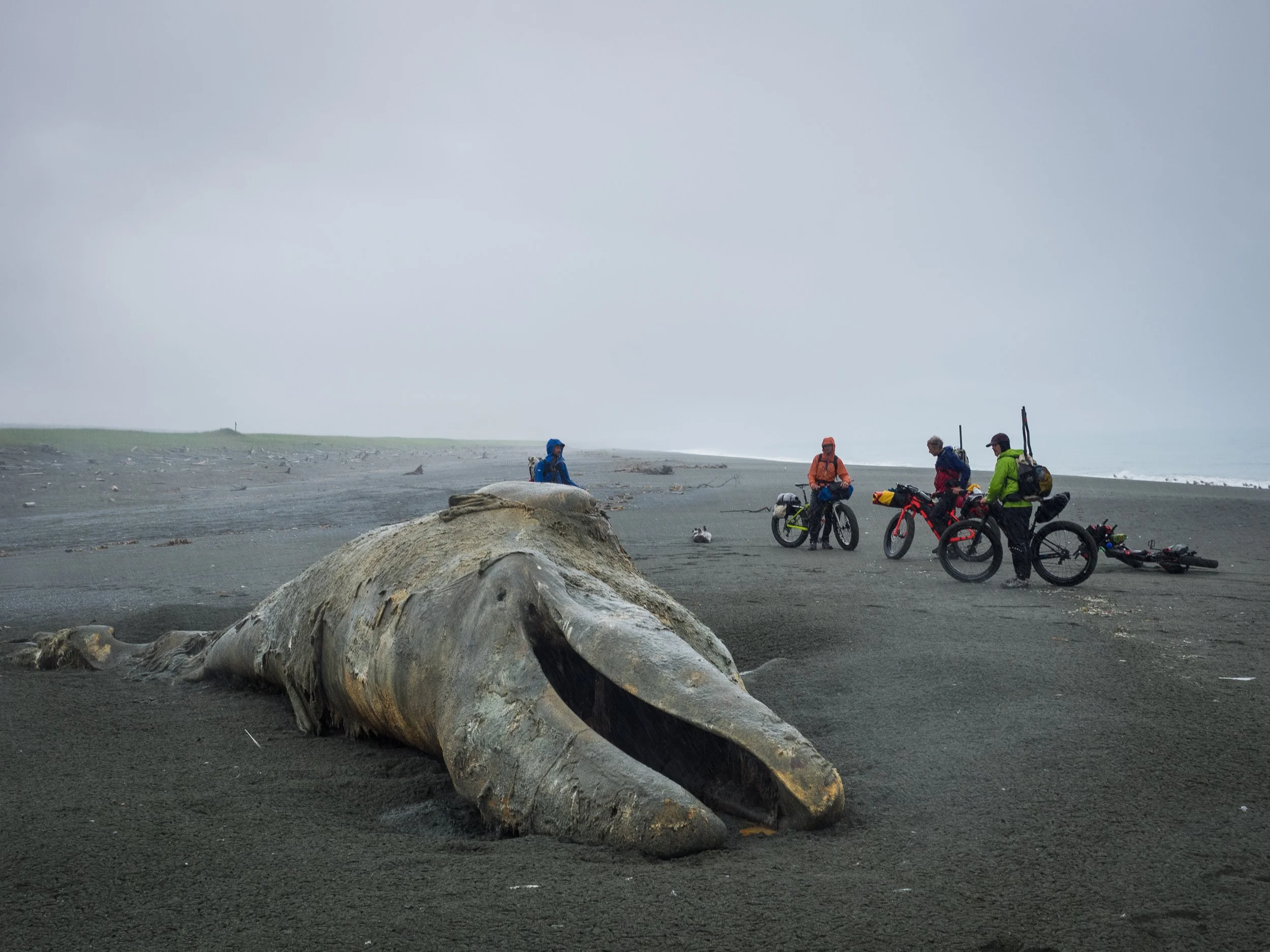 And so the morning progressed. As a group, we were strung out down the coast, each alone in our battle of the varying sand conditions accompanied by a stiff southern headwind as a bonus challenge. Having put our pack rafts away after the crossing of Controller Bay, we had been looking forward to an extended amount of beach riding without any major bays to cross. We knew we had some major rivers to cross, but we wouldn’t be doing multiple “disaster” style crossings every few miles. No matter how efficient going from bike to raft and back to bike, our pace always suffered during these transitions. With the soft sand, rain, and headwind, we might as well have been crossing bodies of water, as our going was slow. Our morning of struggles continued interrupted only by a welcomed rest to marvel at the carcass of a massive whale washed up on the beach and the icy, spooky crossing of the Seal River.