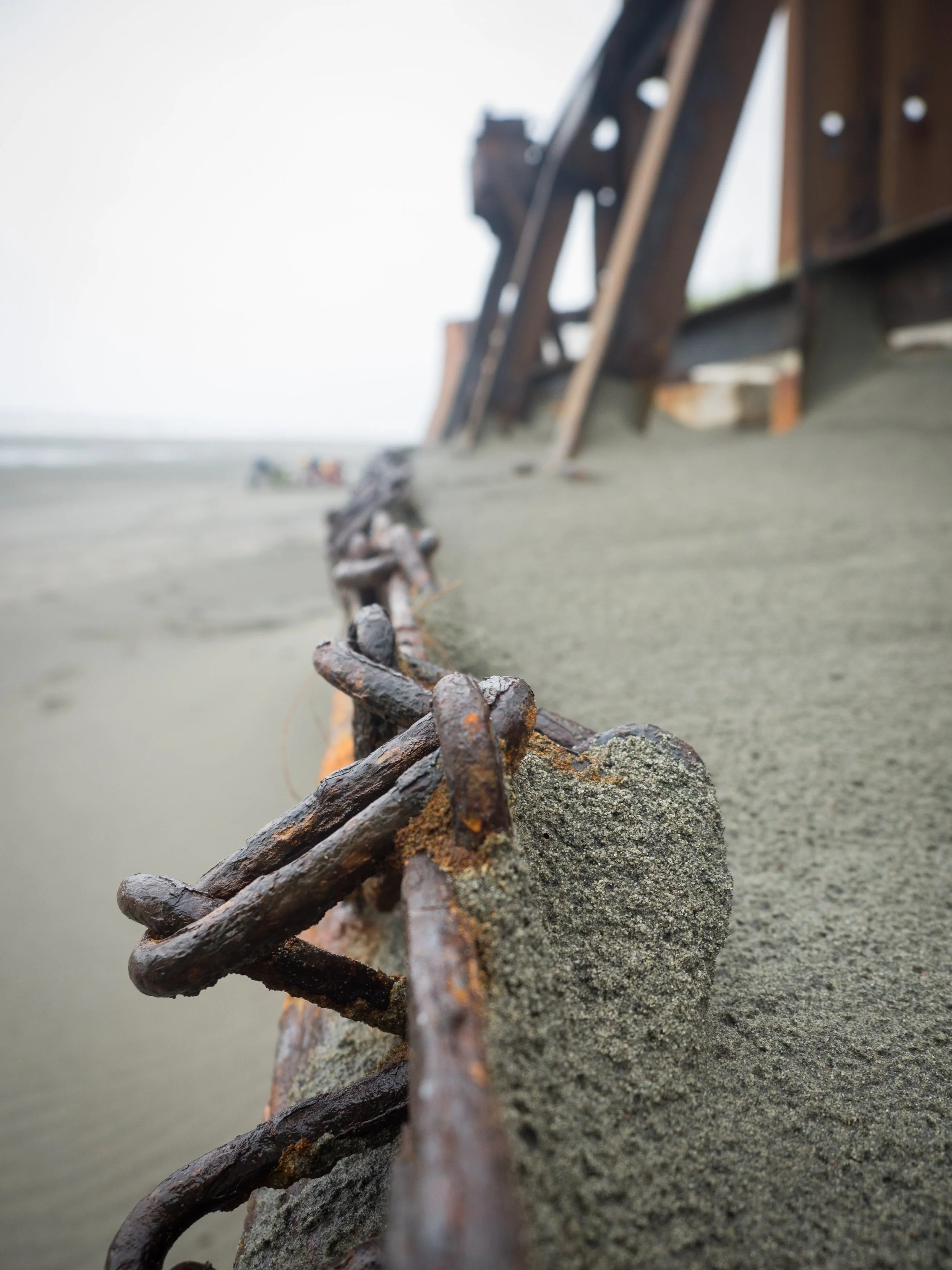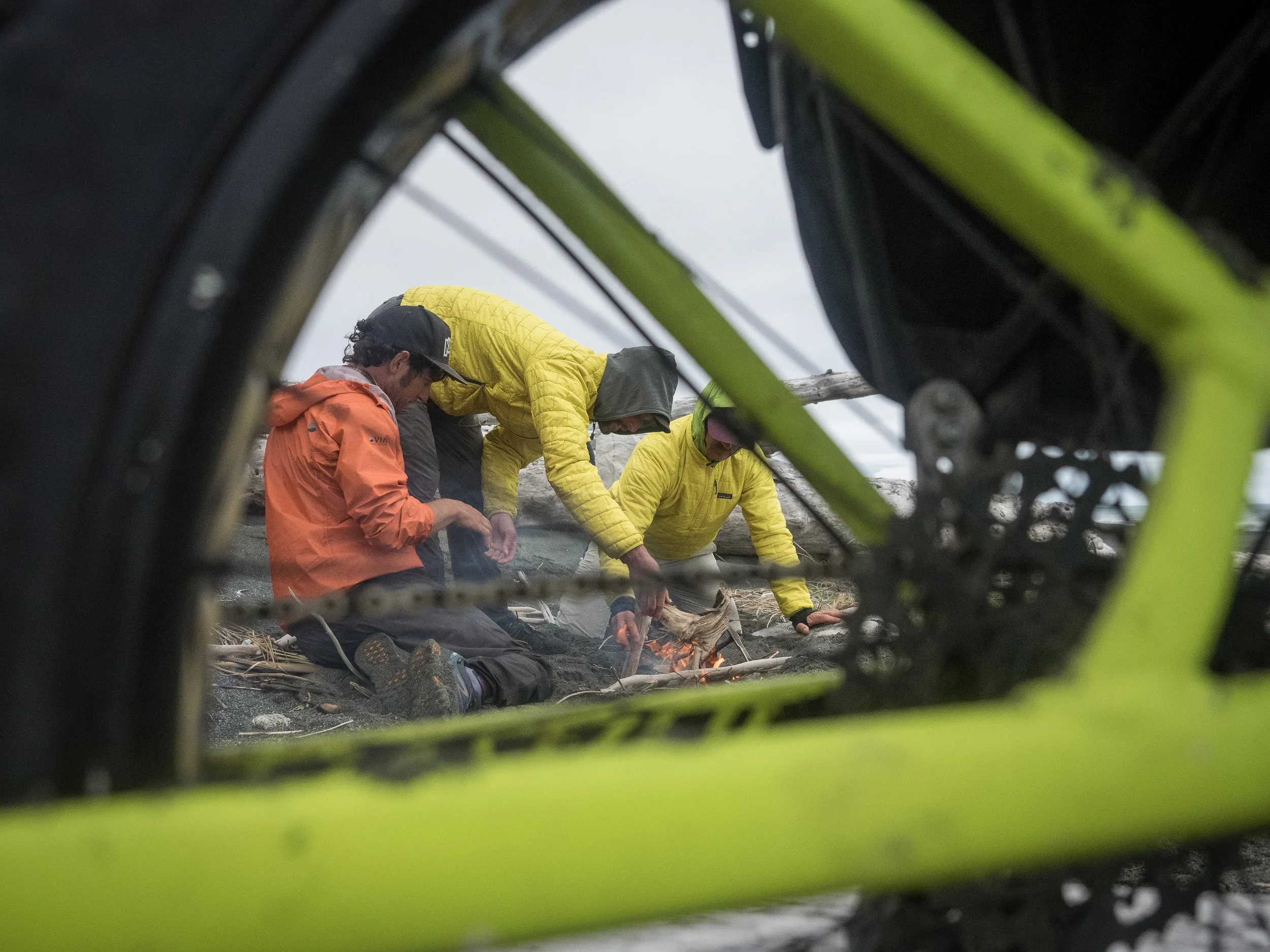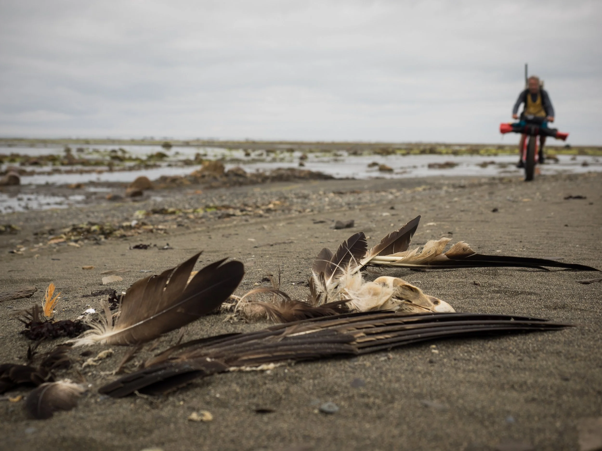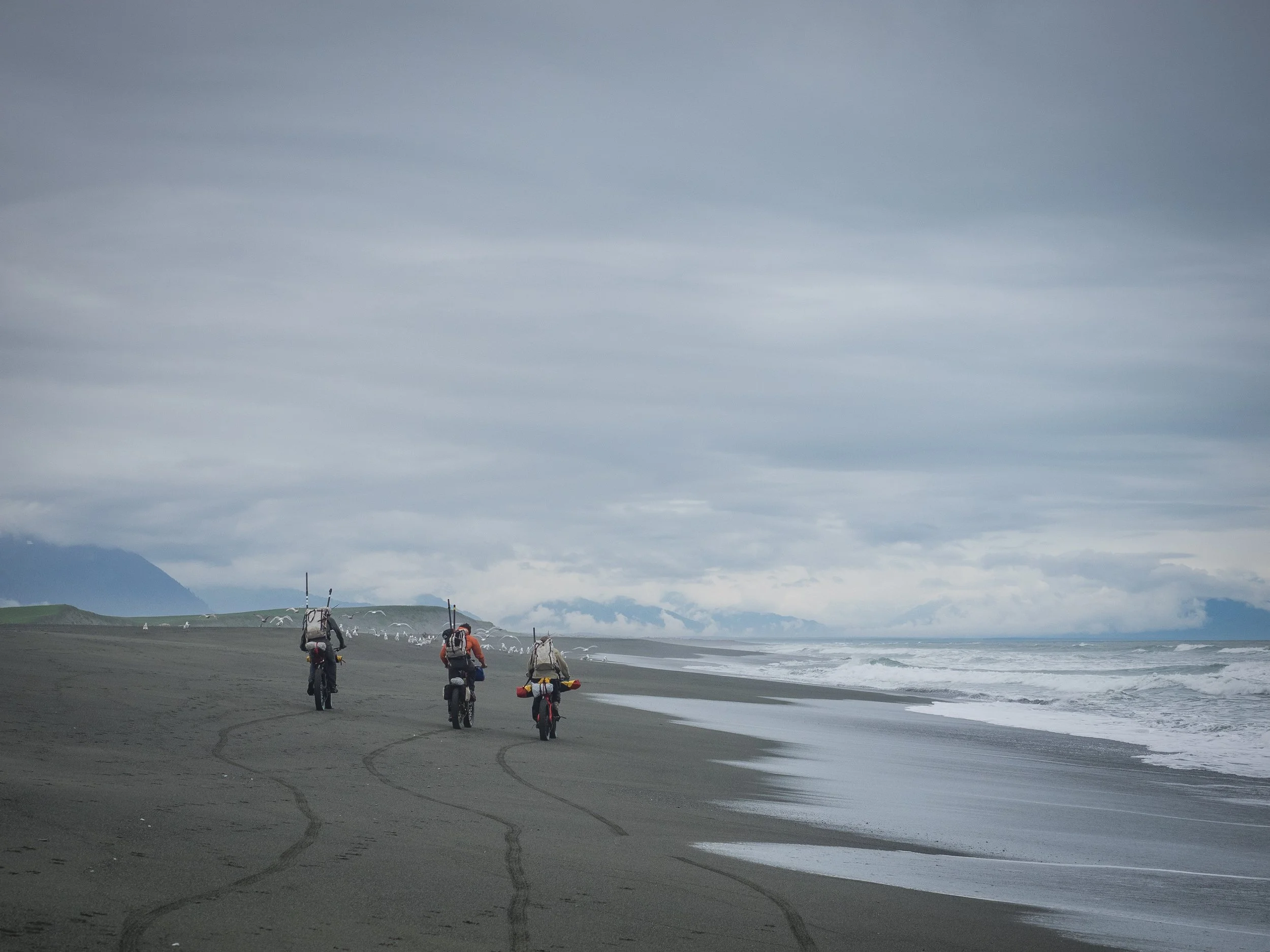 And so the morning progressed. As a group, we were strung out down the coast, each alone in our battle of the varying sand conditions accompanied by a stiff southern headwind as a bonus challenge. Having put our pack rafts away after the crossing of Controller Bay, we had been looking forward to an extended amount of beach riding without any major bays to cross. We knew we had some major rivers to cross, but we wouldn’t be doing multiple “disaster” style crossings every few miles. No matter how efficient going from bike to raft and back to bike, our pace always suffered during these transitions. With the soft sand, rain, and headwind, we might as well have been crossing bodies of water, as our going was slow. Our morning of struggles continued interrupted only by a welcomed rest to marvel at the carcass of a massive whale washed up on the beach and the icy, spooky crossing of the Seal River.