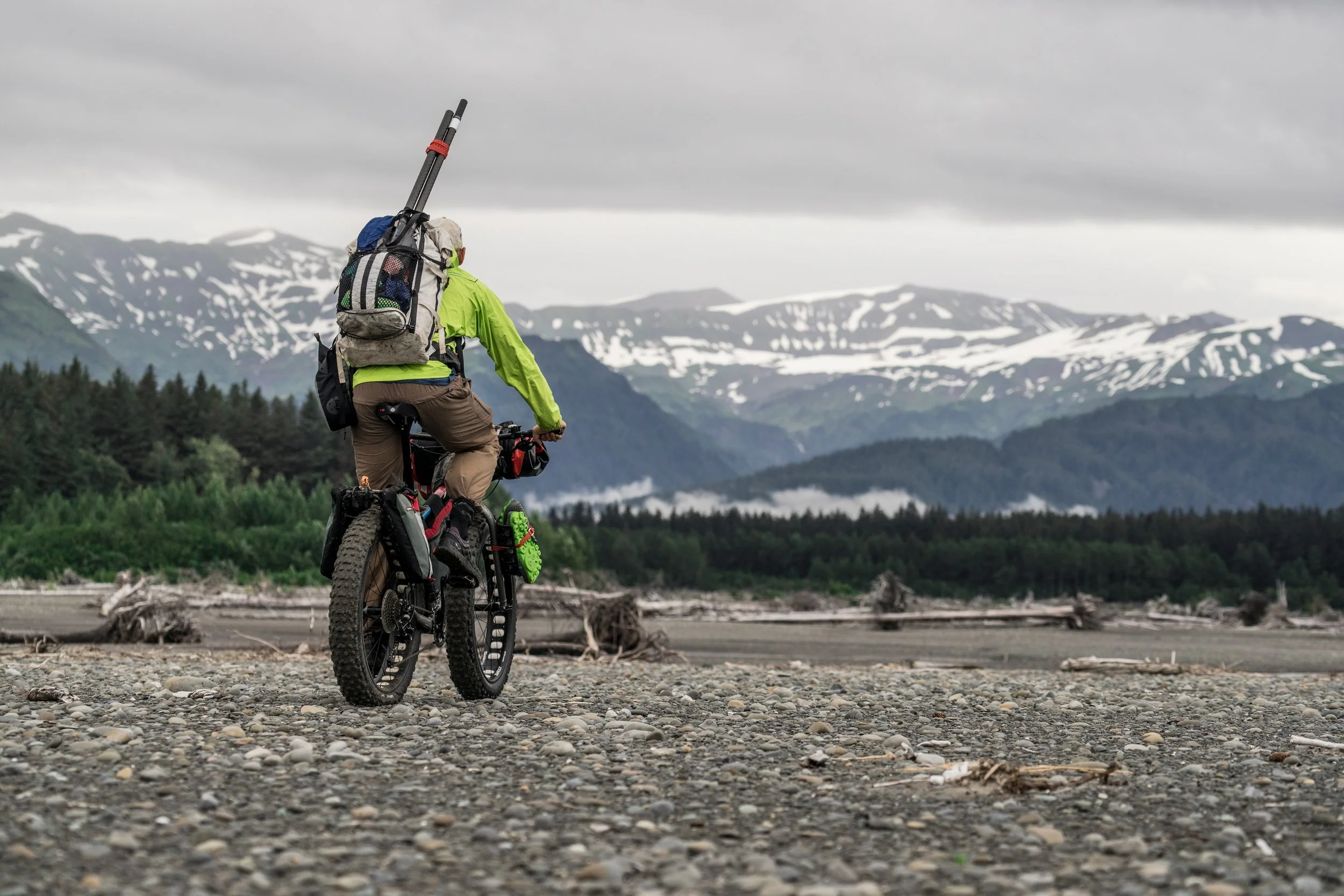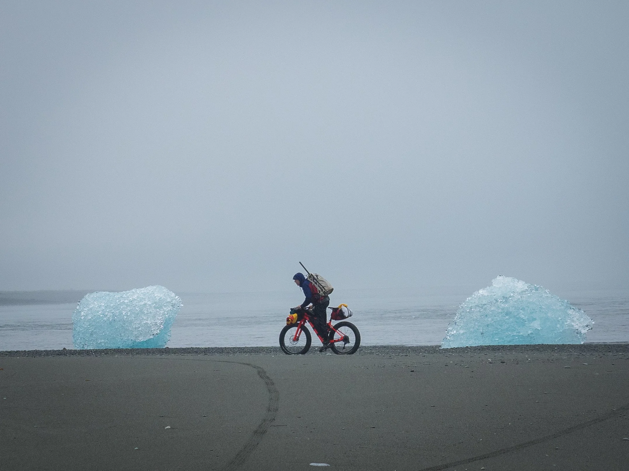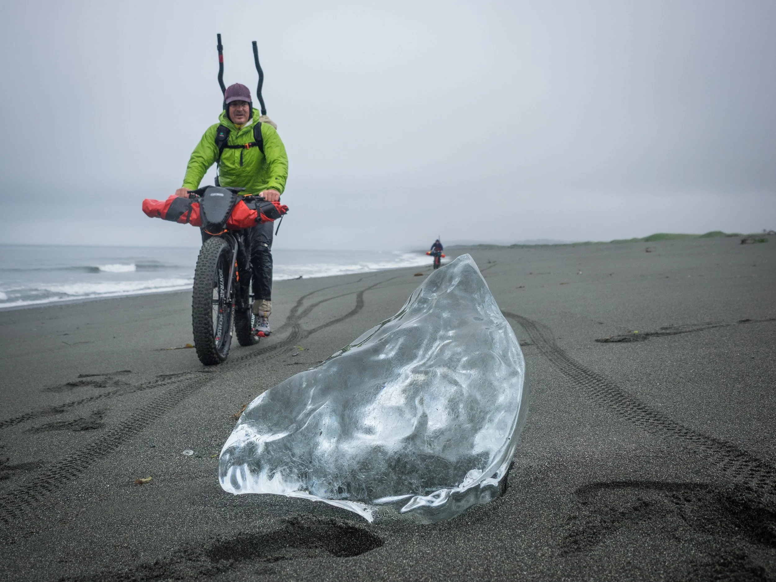 The deep blue glacial water was flowing to the open ocean at a pace that raised our heart rates when we saw it. We would have to start our crossing a little way upstream in order to ensure that the fast moving water did not carry us into the thundering surf of the ocean. Along with the accelerated current, we would have to dodge car-sized blocks of ice that had calved from the Bering glacier. Needless to say, this first crossing was no walk in the park. Bikes were rigged securely and dry suits were donned. We all made it without issue, but it was exciting nonetheless.