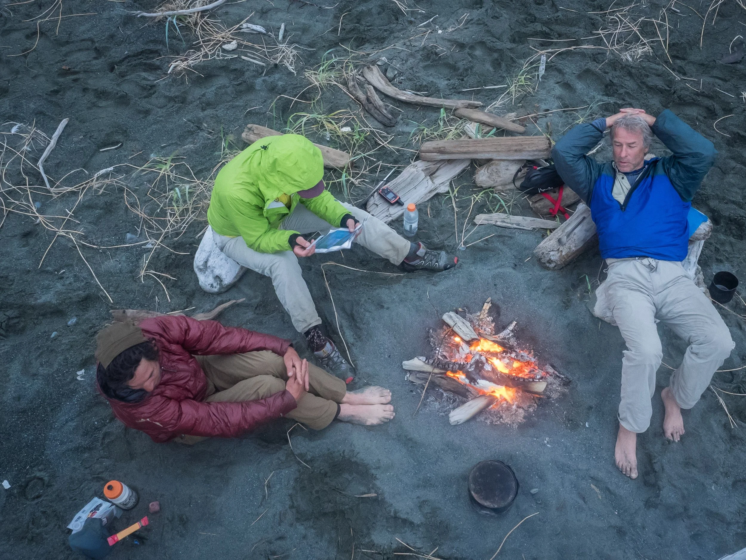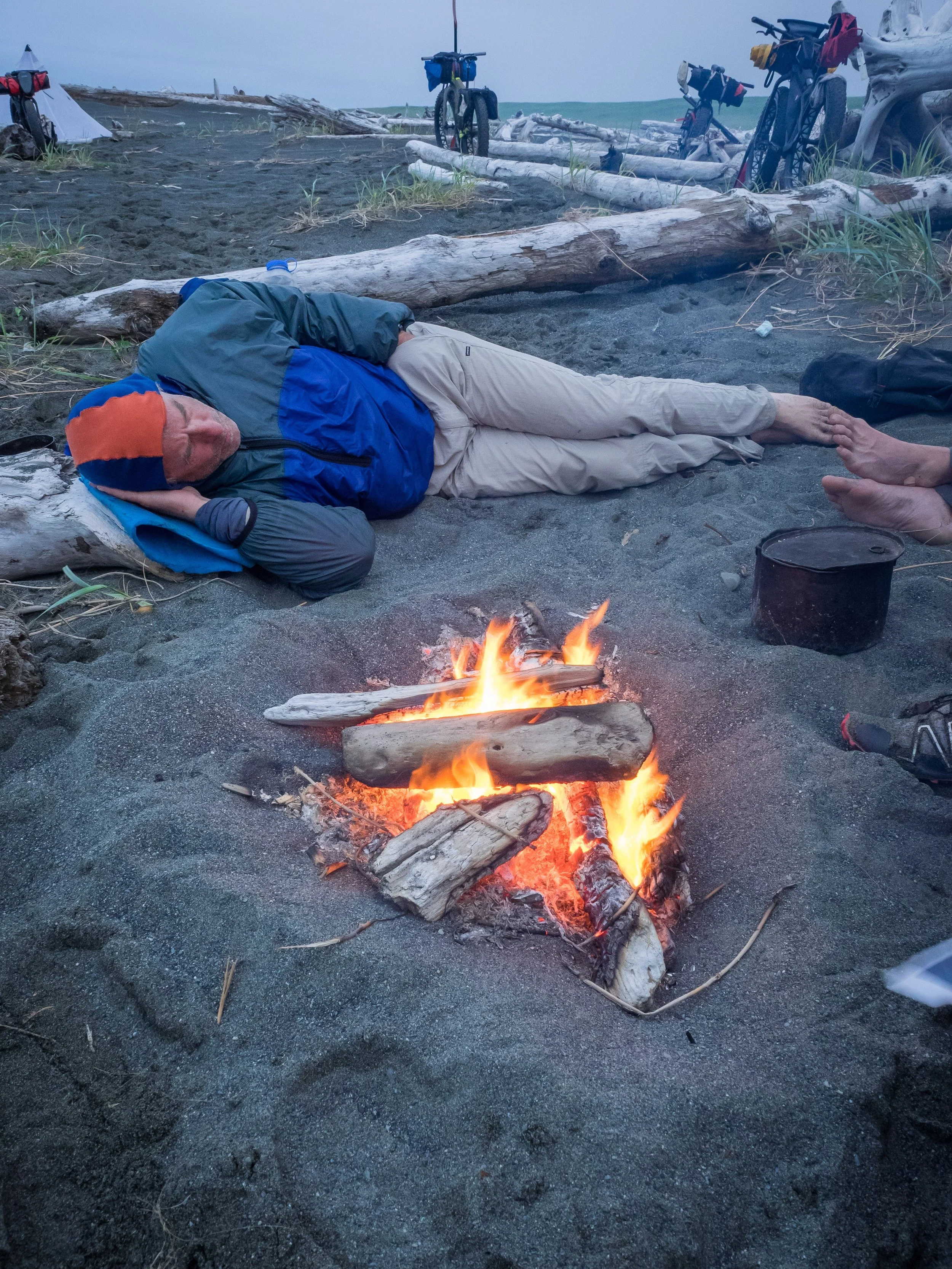 The rest of the day continued with rain, wind, and soft sand. All of us were exhausted by the time we reached the Kaliakh river. Another crossing was in our future, but it would have to wait until the morning. We would huddle by a fire and let the seals on the opposite river bank have their space for the evening.