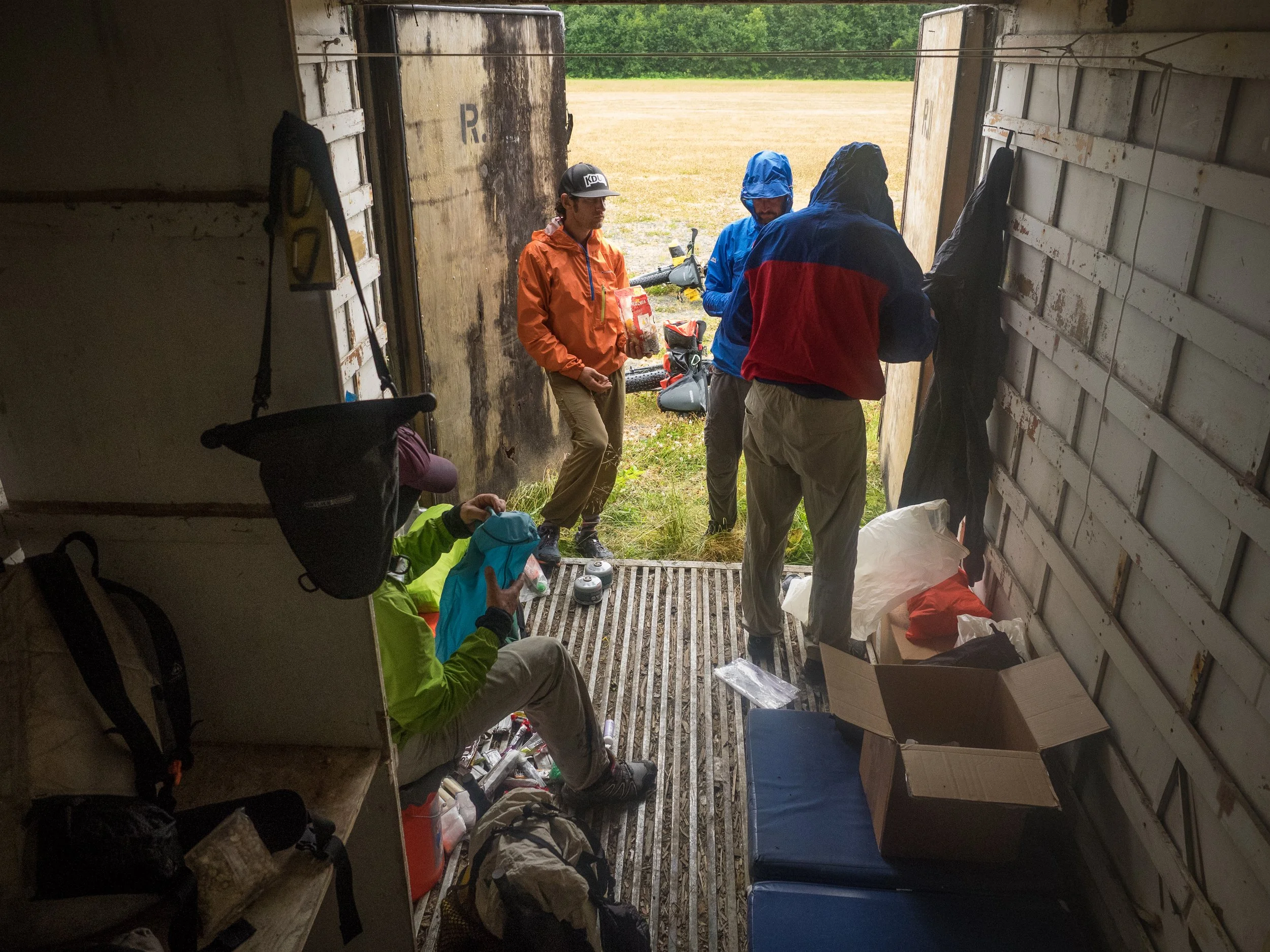 We awoke to more rain and wind…and after the crossing of the slow moving Kaliakh river, more soft sand. Once again we each tackled the elements at our own pace, finding a rhythm that was unique to each of us. We had two goals for the day: first, we needed to reach the airstrip at Yakataga where our resupply of food was waiting for us in a shipping container; and second, we hoped to find an old logging road that would get us off the sand and accelerate our pace to our next bay crossing.
