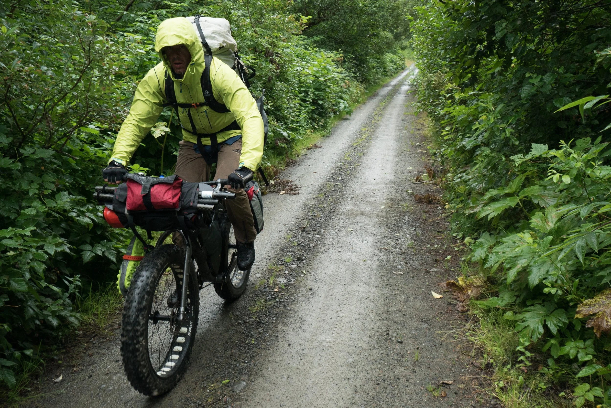 In 2010, the indomitable, Andrew Skurka, walked our route as part of his 4700 mile, six month journey through Alaska and the Yukon. Roman had assisted him in his planning for the trip and had even joined him for a couple of segments of the adventure. Consequently, Roman brought a copy of Skurka’s annotated maps. According to Skurka, there existed an old logging road that ran from Yakataga to Icy Bay—nearly 40 miles. In his notes about the road, was the warning to watch out for bears, as his encounters with these intimidating creatures were frequent. With full bellies and frame bags bursting at the seams from the additional food, we found our road and sped our way towards Icy Bay.