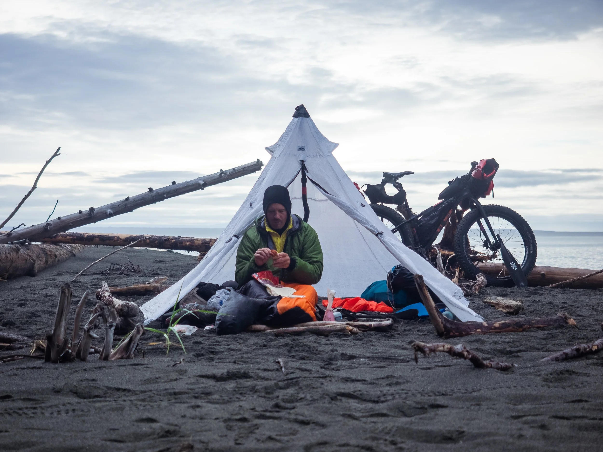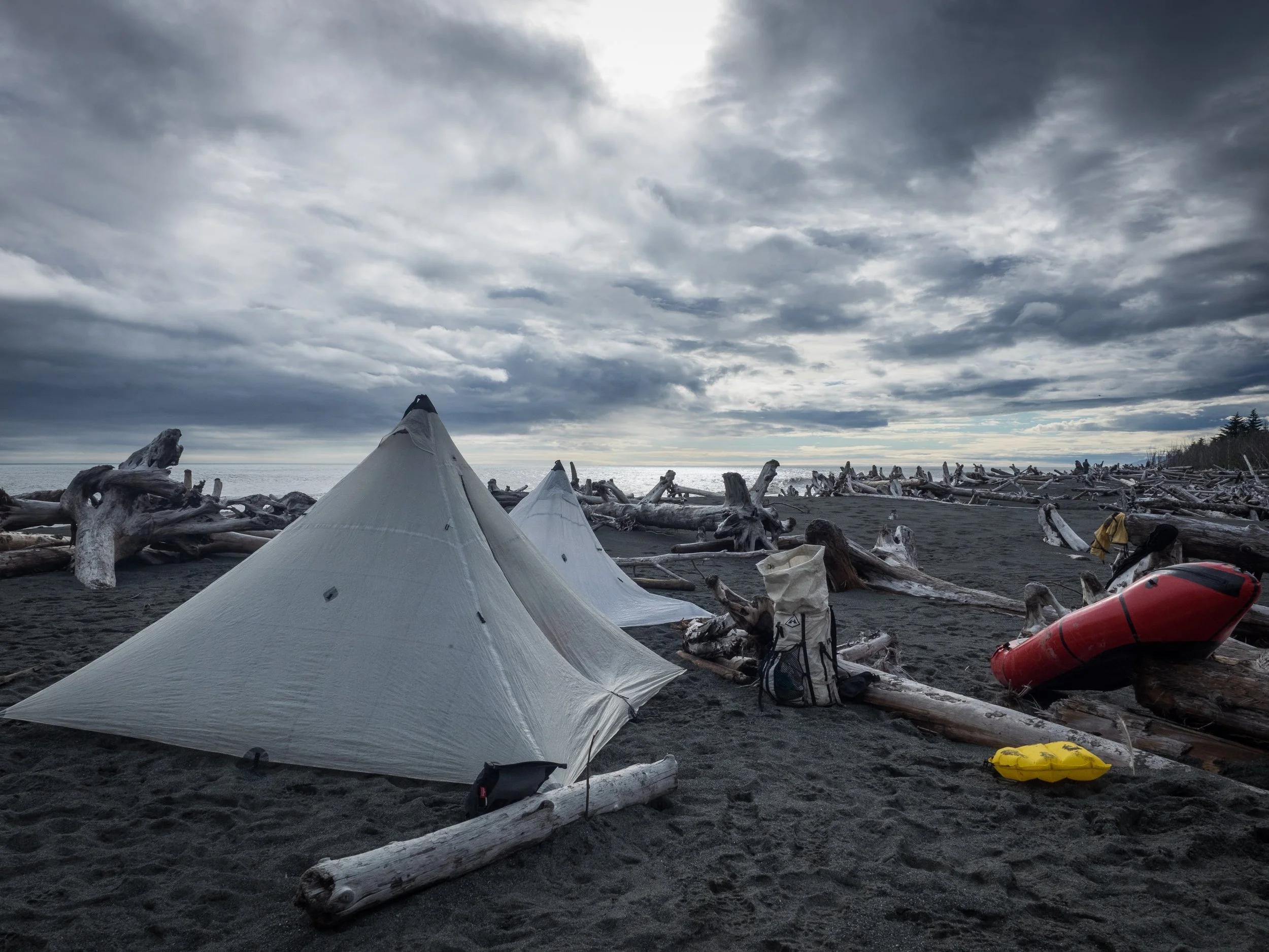 For the third day in a row, I was awakened from a dreamless slumber to the sound of rain tapping out a consistent rhythm on the cuben fiber above my head. The weather gods were letting us have it, as they have for virtually every adventurer who attempted this lonely coast. I lay in my damp sleeping bag watching droplets of water form on a crease above my head, before the pull of gravity was too much and the bubble of moisture free fell onto the camera bag lying next to me. I was unmotivated to leave our present confines. I knew what was out there and by the sounds of things, there was no indication that the conditions had improved. If anything, they sounded worse.