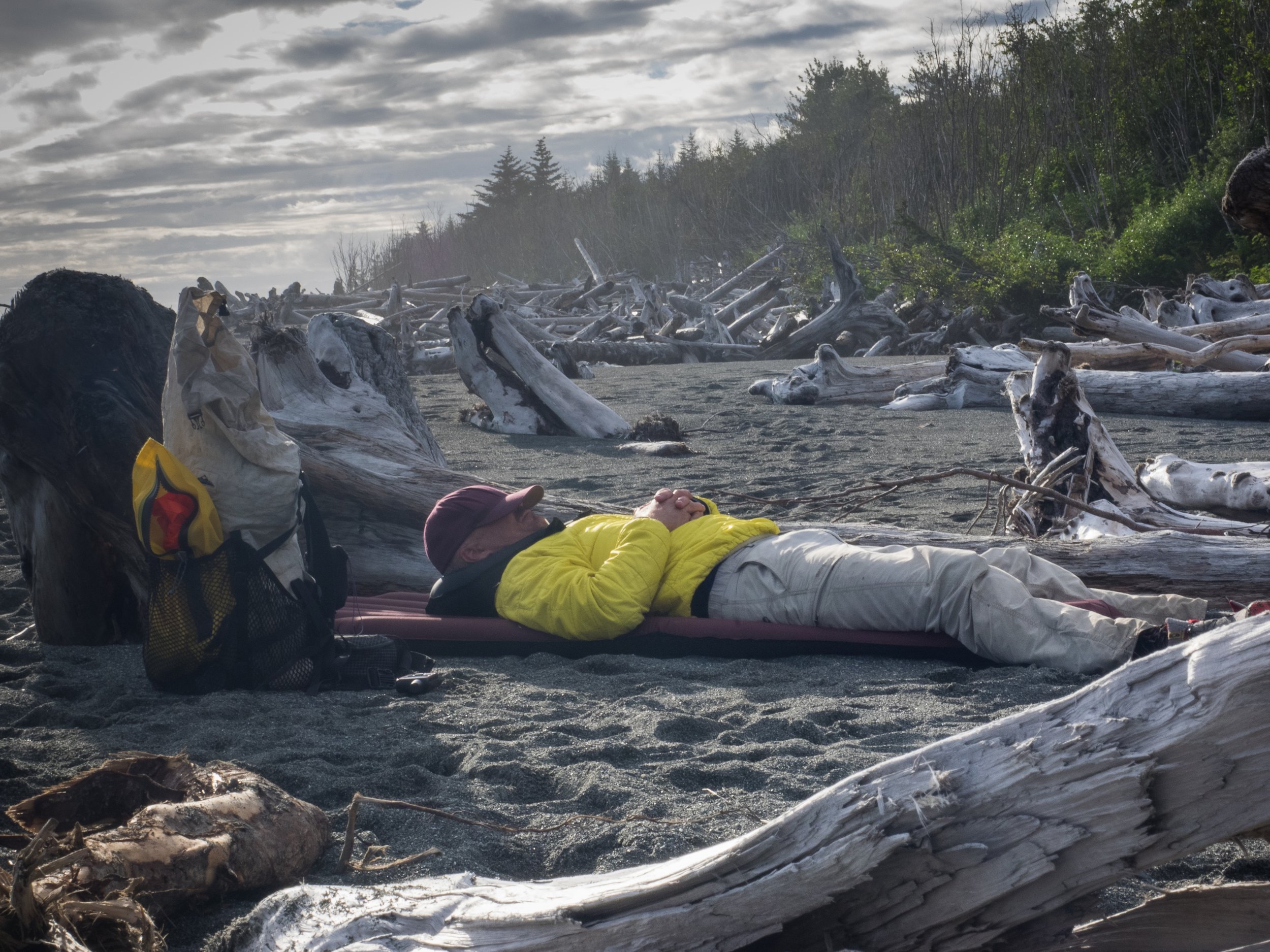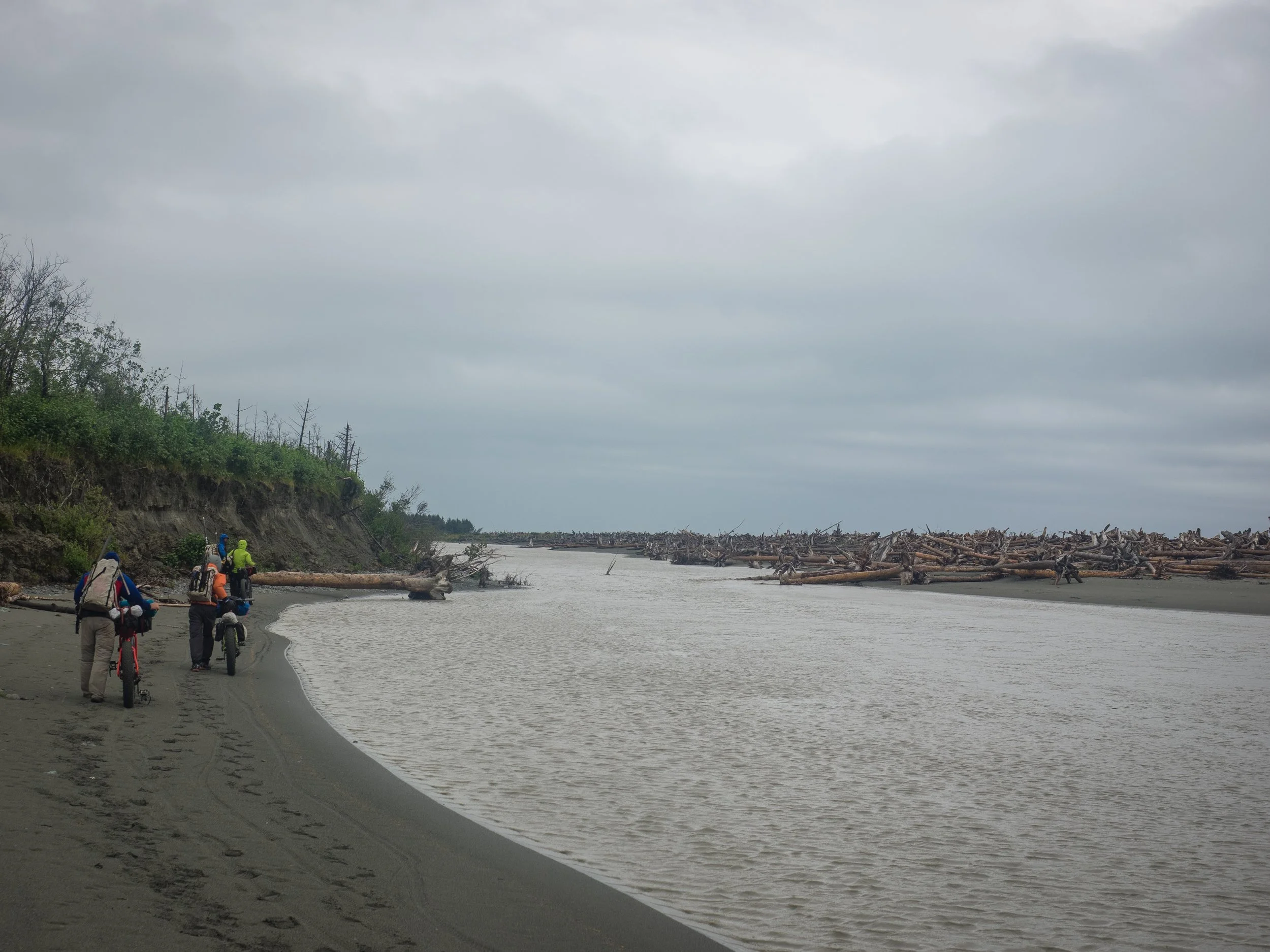 Shortly after lunch, we arrived at the Big river. It was high tide. The river was choked with recently fallen trees flowing in chaos into the angry surf. Watching root ball after root ball tumbled towards the ocean, we knew that there was no way to cross the river in its present state. Once in the ocean, the trees were tossed like twigs by an 8-foot surf. Branches snapped. Trunks were thrown onto the beach. Mother Nature’s power was impressive and humbling. With little choice, we retreated behind a stand of trees and began to set up camp. We would have to wait for the tide to go out and see if the conditions changed allowing us to safely ford the river.