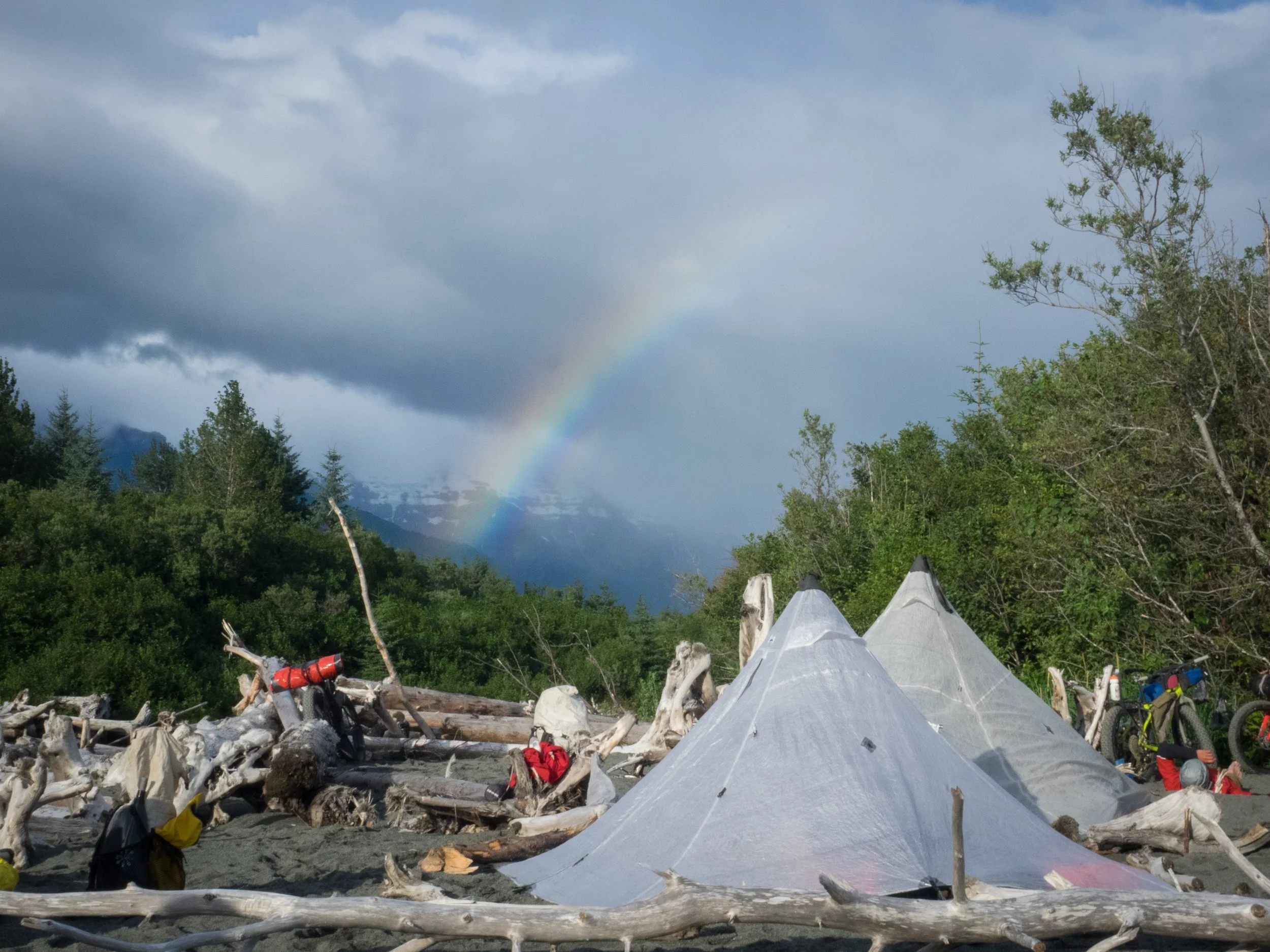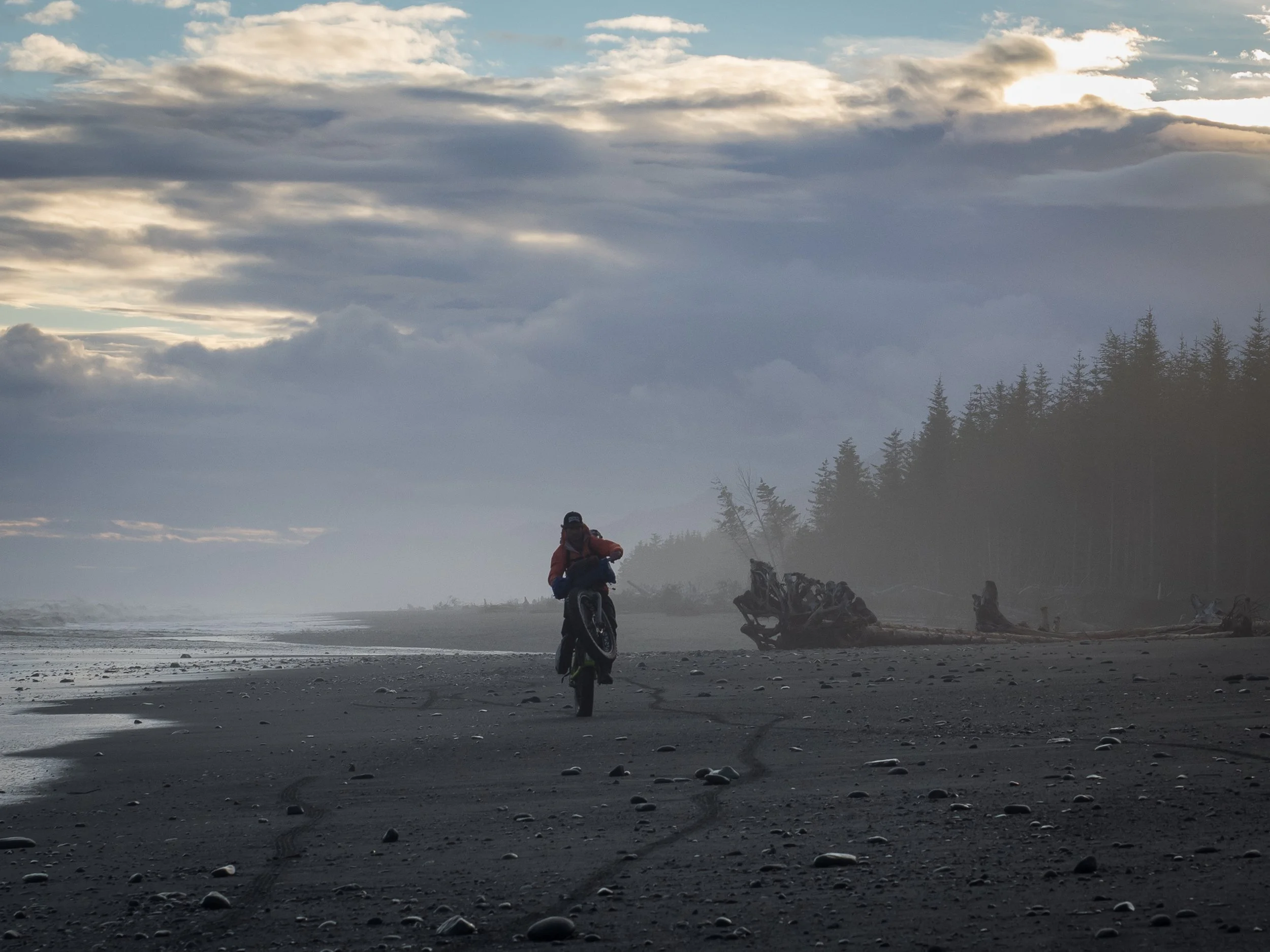 As if our luck had shifted with the turning of the tide, the sand on the other side of the Big river was solid and supportable for our big tires. We were able to roll with ease and take advantage of the low tide to get around a portion of the coast that would have been unnavigable at high tide. Sandwiched between an ever falling cliff of sand on our right and a churning sea on our left, we motored forward not wanting to be pinched out with the changing of the tides. An hour into our ride, we caught another break and discovered some double track leading from the beach. With the lost road still on our minds, we followed the track which soon became a solid gravel road. We had regained our road. Along this portion of the coast, its existence had not been reclaimed by the old growth forest through which it traversed. With fading light, we motored to the edge of Icy Bay…the next crux of the trip.