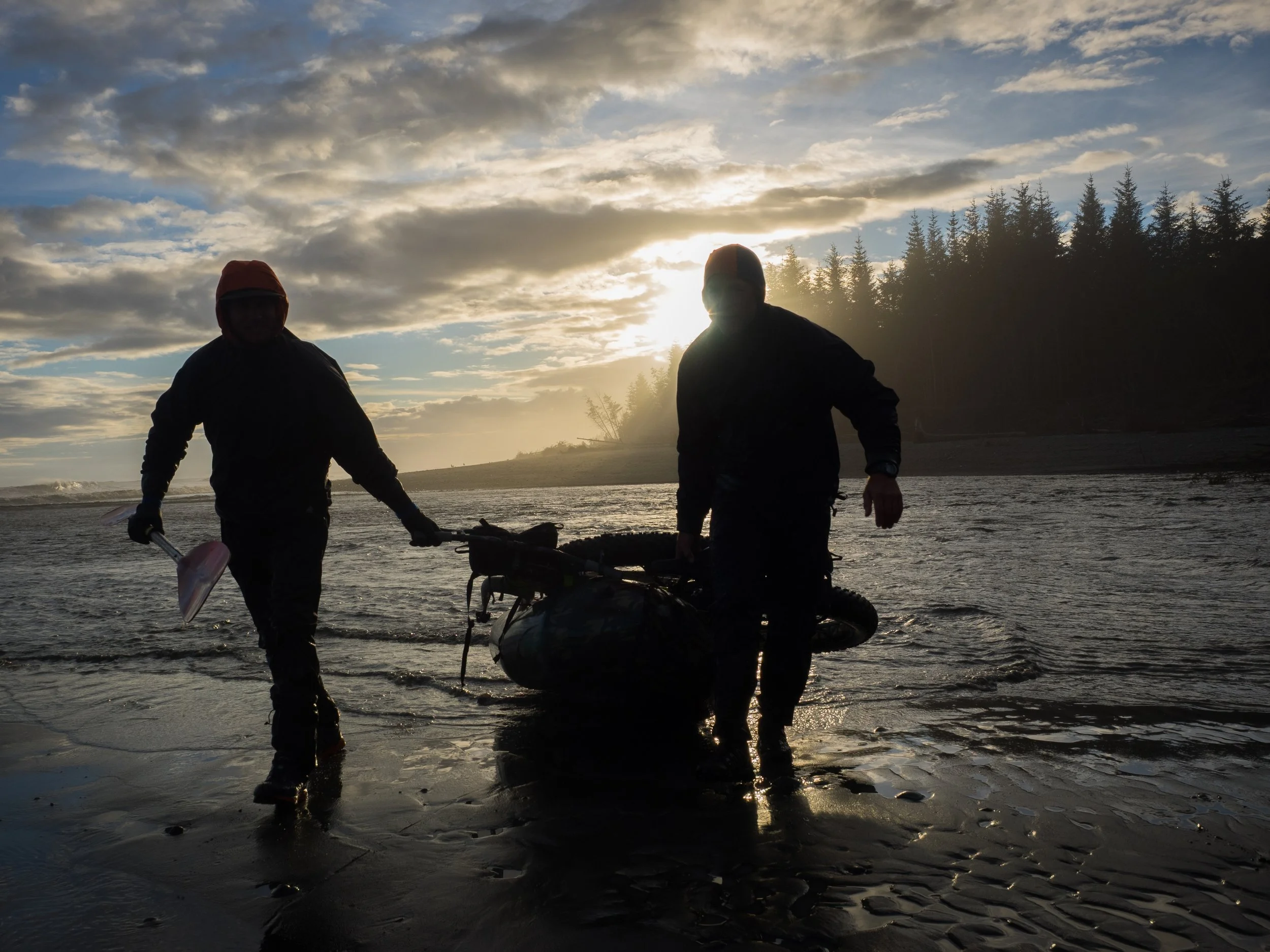At 9 PM, we ventured a peek at the conditions of the river. With low tide just 45 minutes away, we came upon a totally different scene than what we had witnessed six hours earlier. The river was no longer backed up from the high seas with trees rolling blocking a safe passage across the torrent. The conditions were such that we could cross without mishap. Breaking down camp we made the crossing in the shadow of a setting sun. It was stunning.
