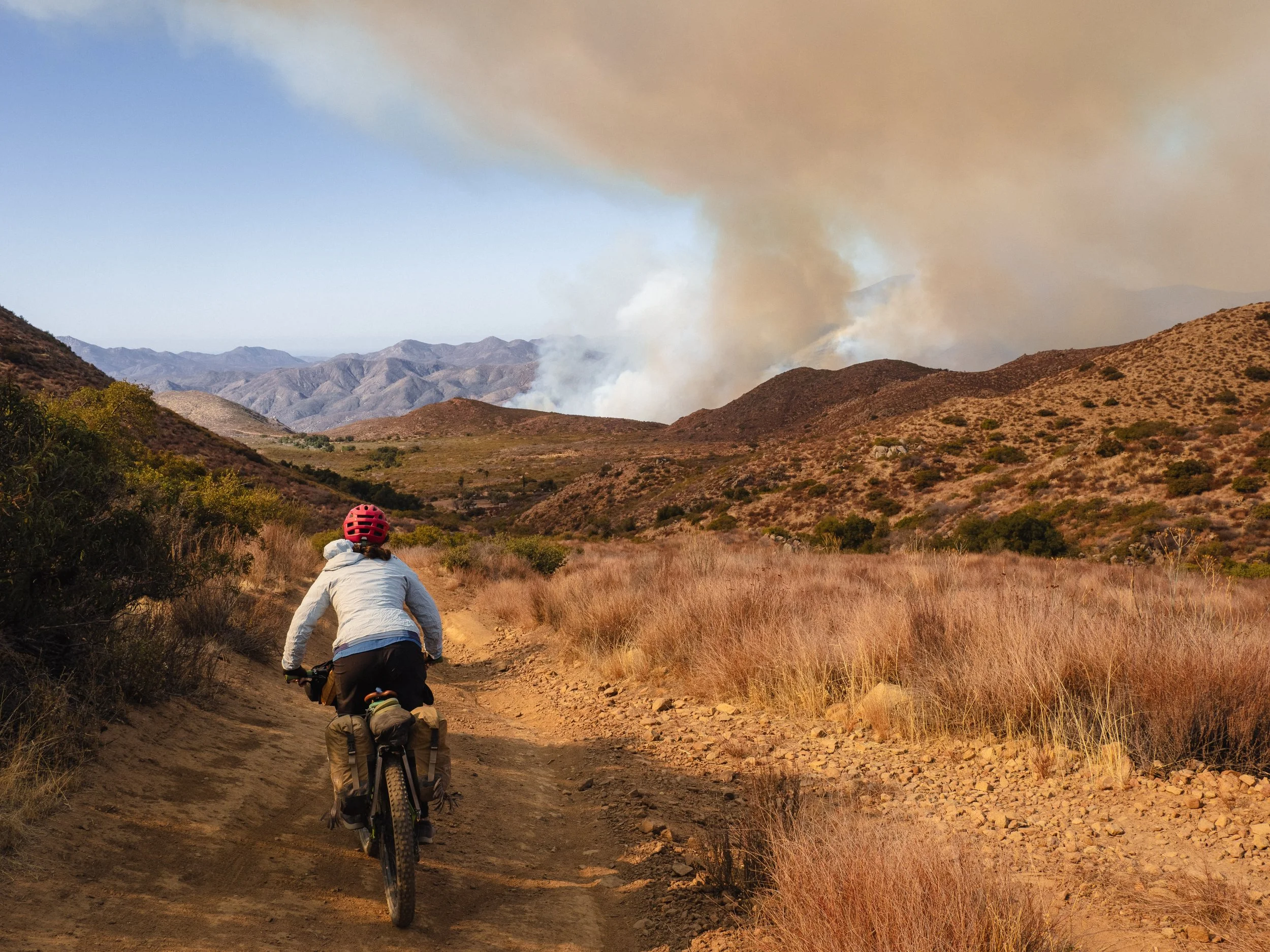 In the preceding three weeks, we had suffered quite a bit both physically and emotionally. Reality did not meet the vision. Since pedaling out of San Diego we had dodged two wildfires, the first one preventing us from crossing the border into Mexico on day one and leaving us wondering if would even be able to continue. The roads, double track, and trails of the route were demoralizing at times with their steep ascents and burly descents that were rocky, rutted, and sandy. The temperatures were anything but warm, with cool, windy conditions during the day, and well-below freezing temperatures at night. At each camp it seemed as if every neighborhood stray cat or dog would find its way under our floorless shelter to nestle next to us in our down sleeping bags. They were trying to escape the fates of our water bottles each morning which were clogged with ice or completely frozen. So much for a bikepacking paradise experience. We were getting worked and needed to come to terms with what this route was going to throw at us. Things were not going to go as planned and we needed to embrace each moment, releasing our previous expectations.