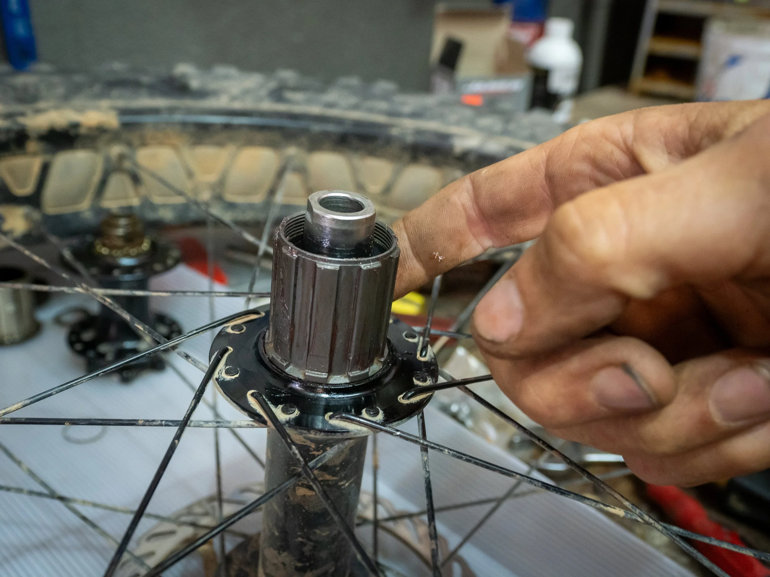 At this point, a crucial decision had to be made. My free hub body was considered unserviceable by the manufacturer which meant it was unlikely I’d be successful in trying to disassemble it and figure out what was broken inside. The only other option to continue our journey on bikes would be to find a new wheel. This seemed like a daunting task and could possibly take weeks as a fat bike wheel would most likely have to come from the U.S. Or Jonathan and I could go against the manufacturer’s judgement and attempt to disassemble the hub anyway; determine what was broken; and then find replacement parts between this shop and the closed one. Embracing the situation and yet more adventure, I began pulling the free hub body apart, while Jonathan searched through Orlando’s parts bin.
