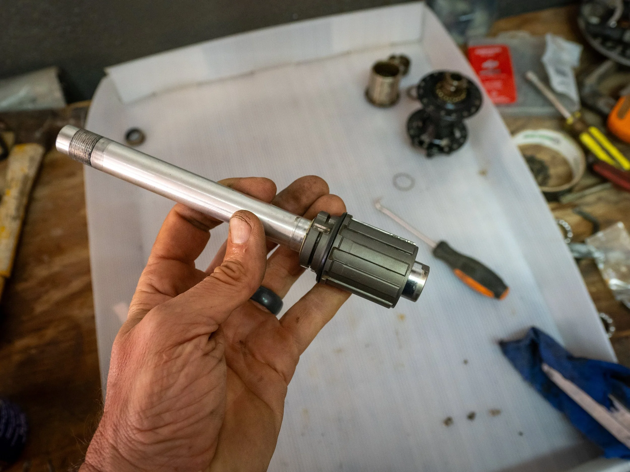 Upon speaking with the owner of the shop (Orlando) who was a local mountain bike racer, he offered us use of his personal bike tools and access to his parts bin in his garage behind the store. Heck yeah! Within minutes my bike was in a stand with the rear wheel removed and the gear cluster off the free hub body. Lying in disarray on his work bench was every tool needed to perform the job.