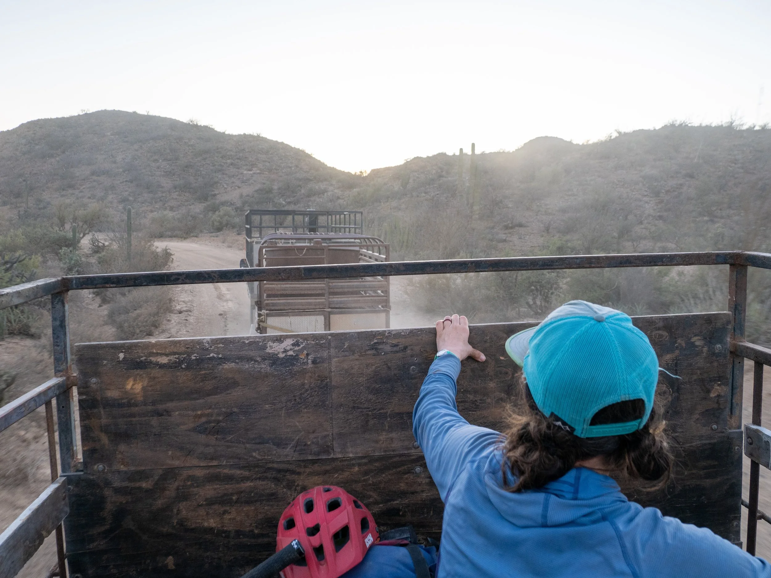 With the hammer trick not working, it was decided that El Bombero Blanco would ride his bike to the little town up the road to fetch the town mechanic. Shortly after his departure every rancher in the area began driving up and assessing the situation. Three different men had their heads under the hood—each speculating on what could be done. After numerous discussions and turns of the ignition key with the same inoperable results, a tow strap appeared, and Diana and I were back in the bed of the truck to be pulled behind a horse trailer that was attached to another truck. We were riding a train. This was going to be interesting.