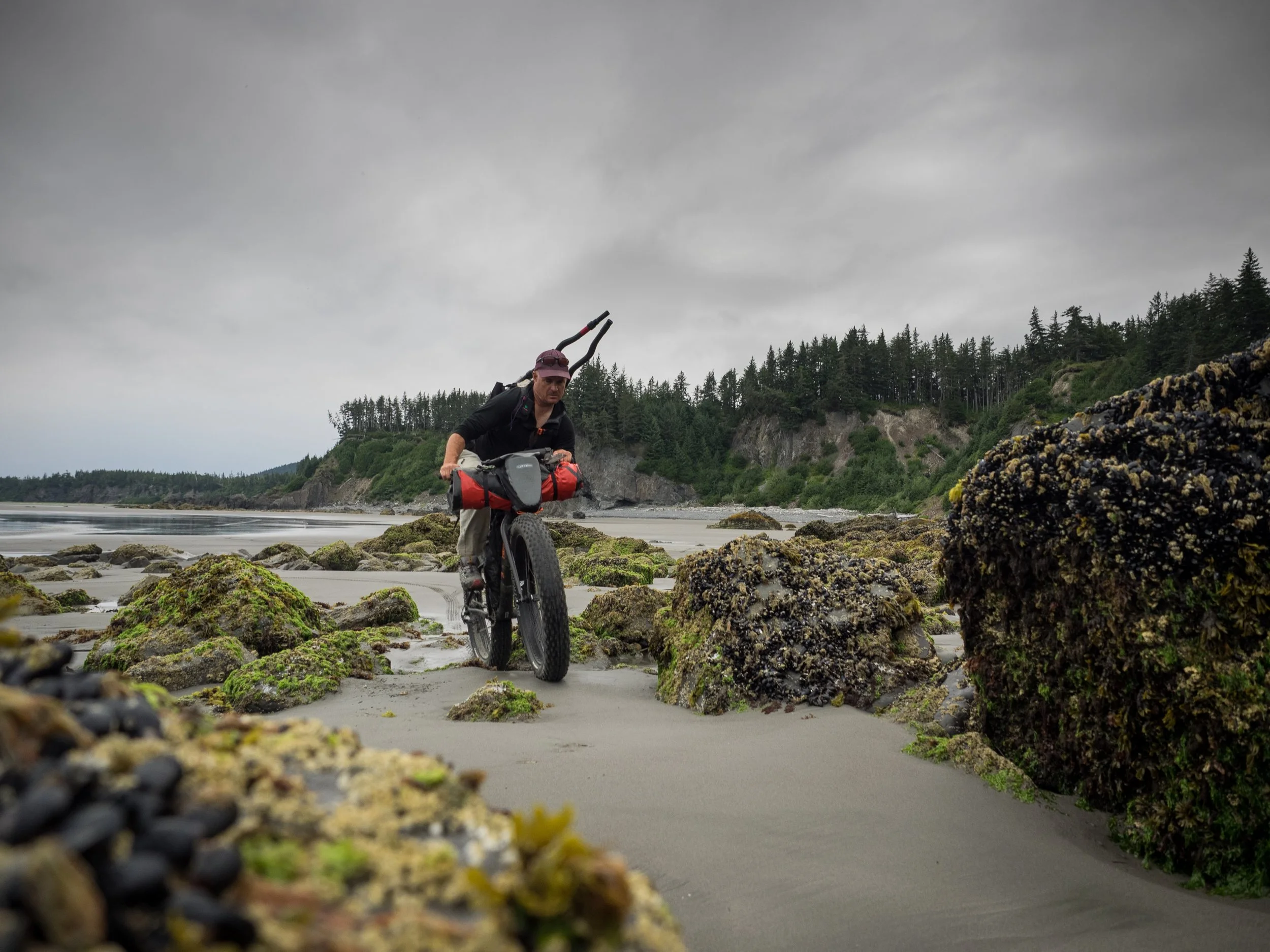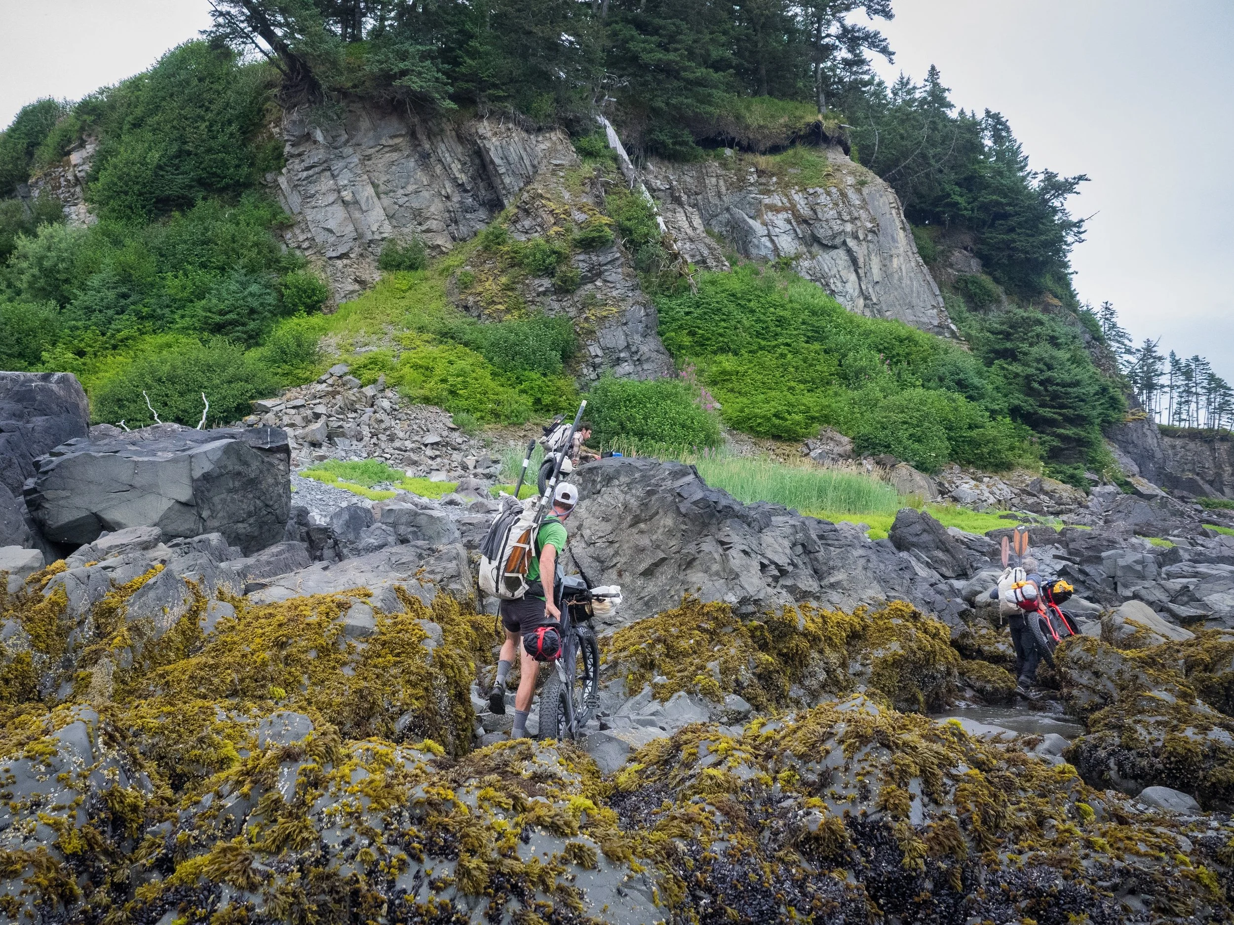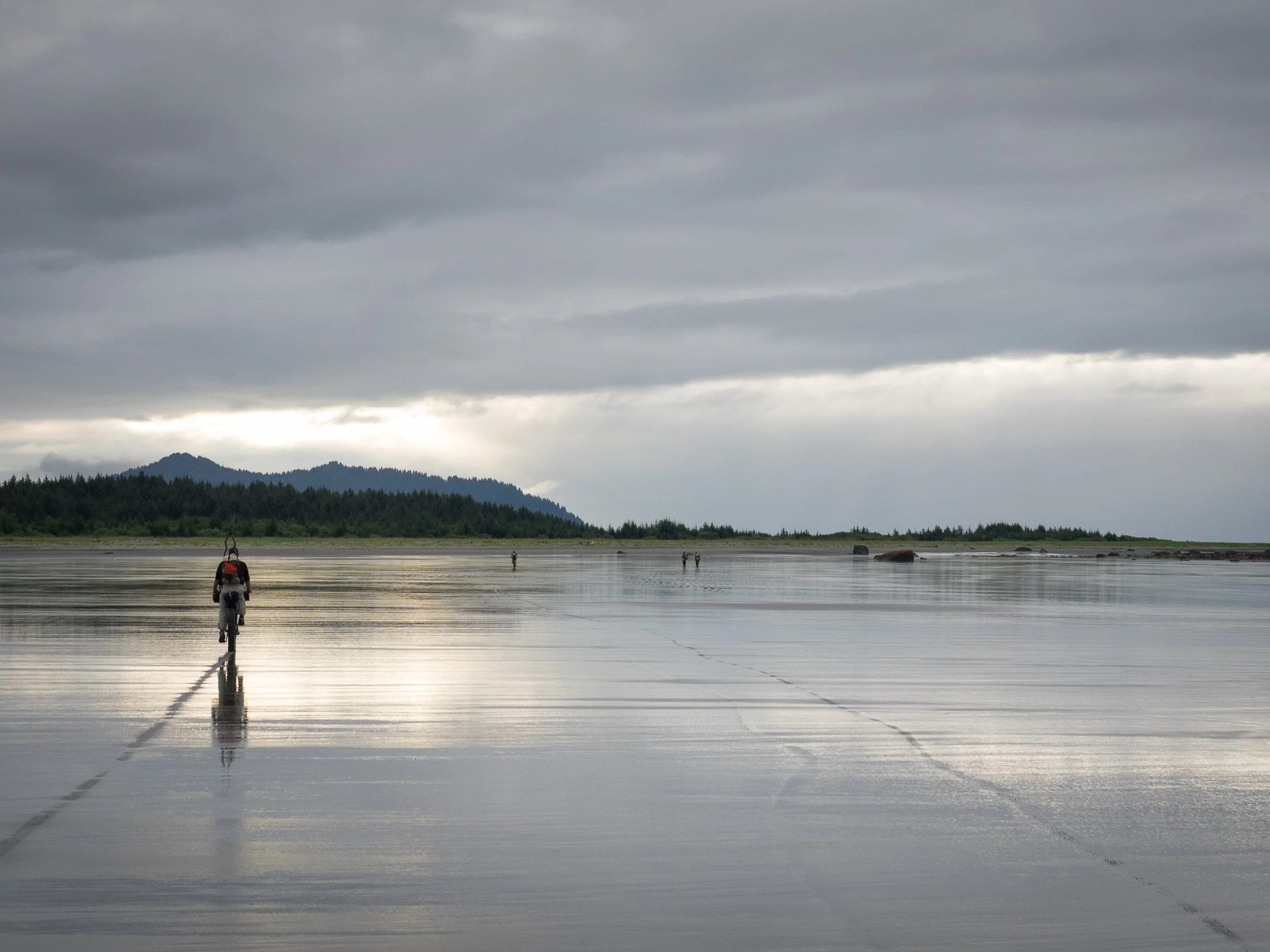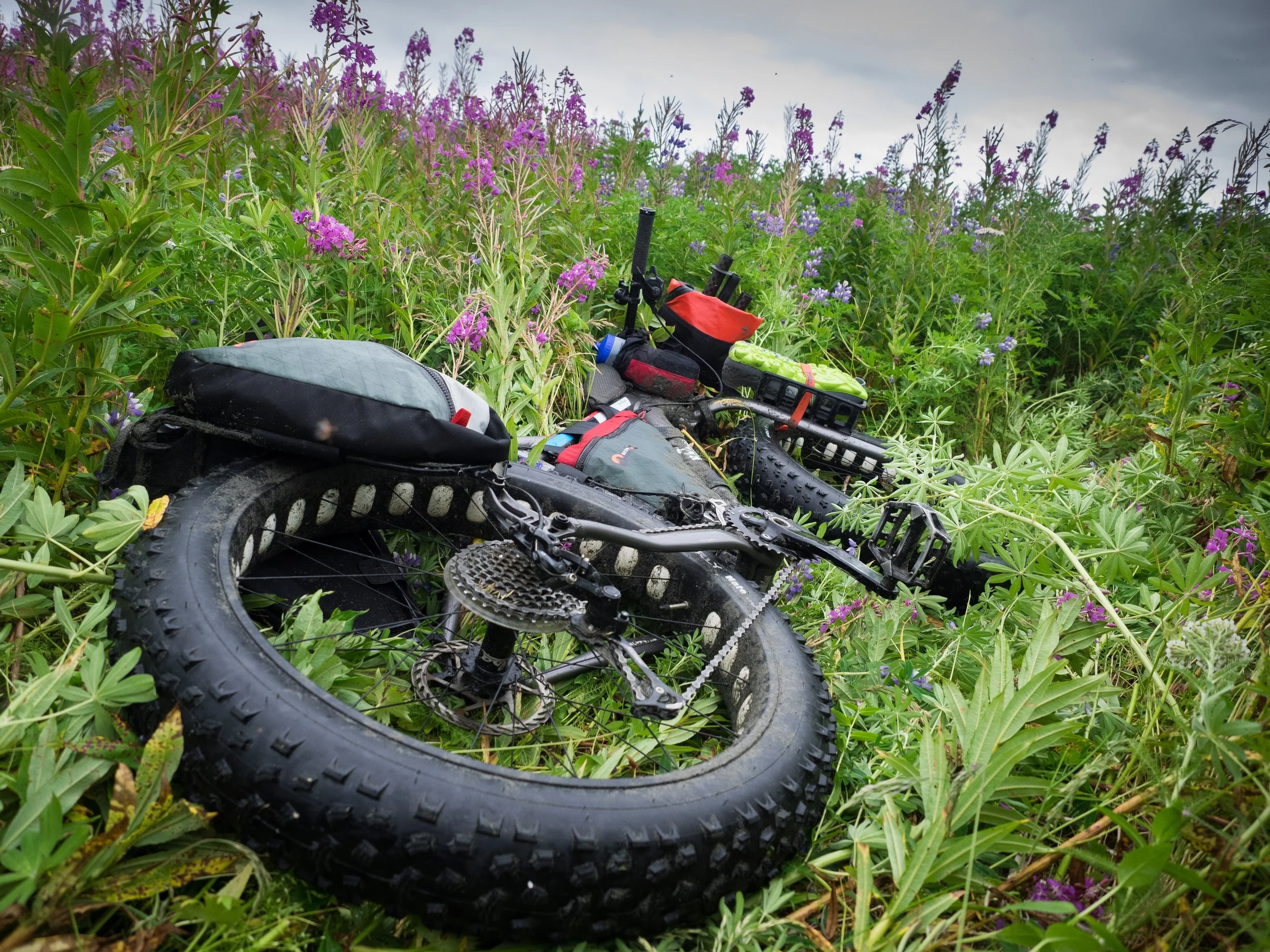 After what seemed like an eternity, I pedaled to the edge of a deep channel of water which was the final obstacle separating us from reaching the high ground of the mainland. We would have to inflate our rafts to overcome this final challenge. Laying my bike on its side, I quickly removed my pack raft from its place on the Anything Cradle and began inflating it. Within 30 seconds, my bike, which had been dry, was now beginning to float from the incoming waters. With a renewed sense of urgency, I captured and squeezed air into my raft. Looking behind me, I saw the others stopping to inflate their rafts as well. Roman was just a silhouette on the horizon, still pedaling. He was going to have a bit of a paddle. With my raft mostly inflated, I recovered my bike and balanced it across the raft for my final disaster style crossing of the day. Wahoo! Controller Bay was crossed. The reward for our efforts was a stunning coast line of vibrant lupine, fireweed, and raspberries. The smell of the flowers was as intoxicating as the myriad of colors dancing across the horizon. What a day!