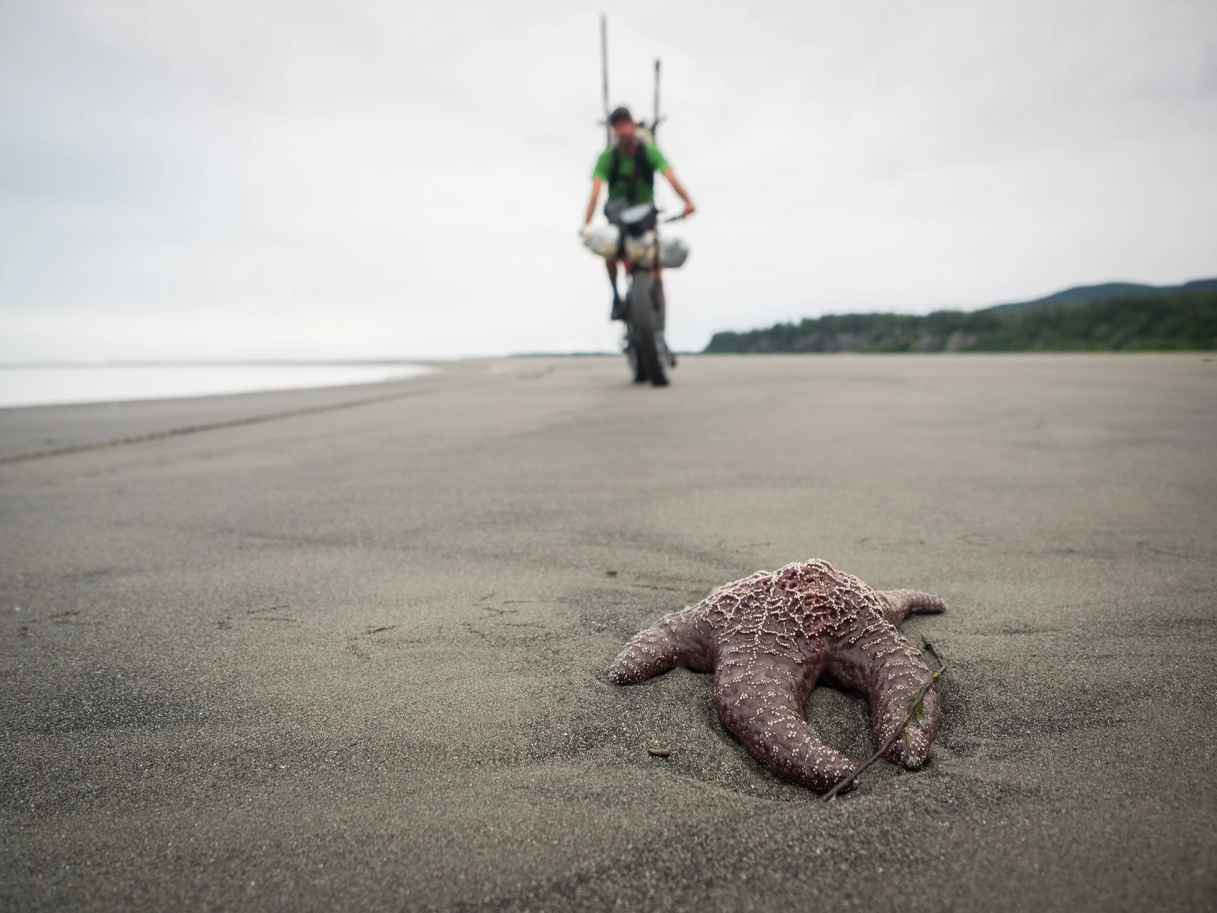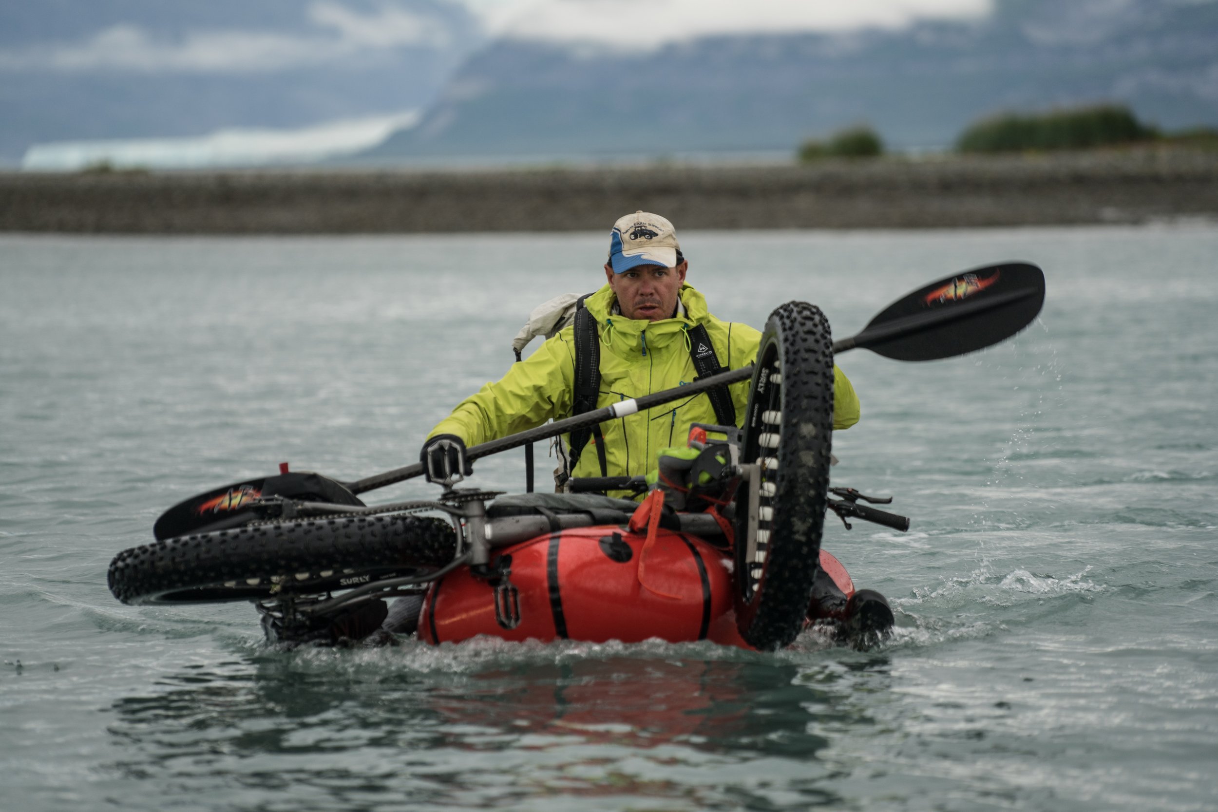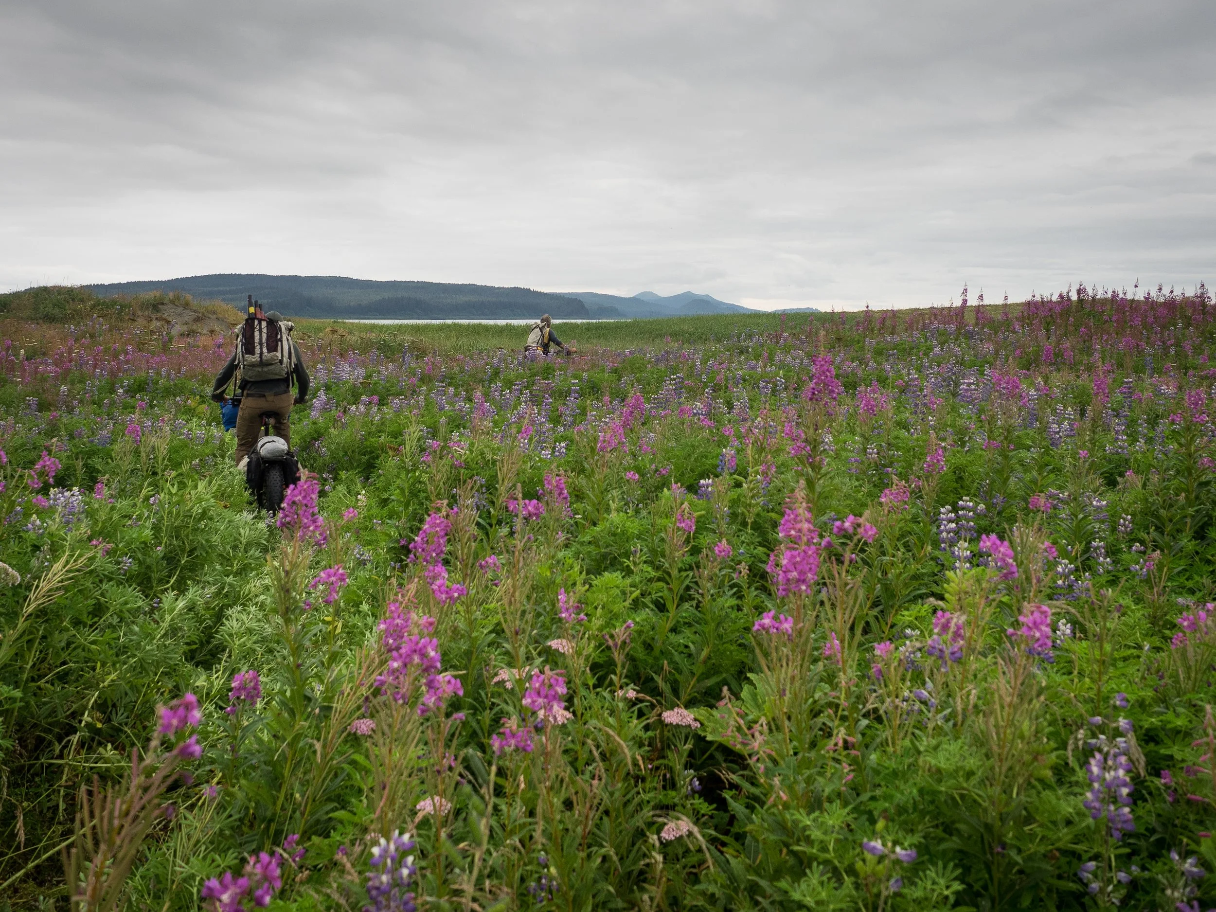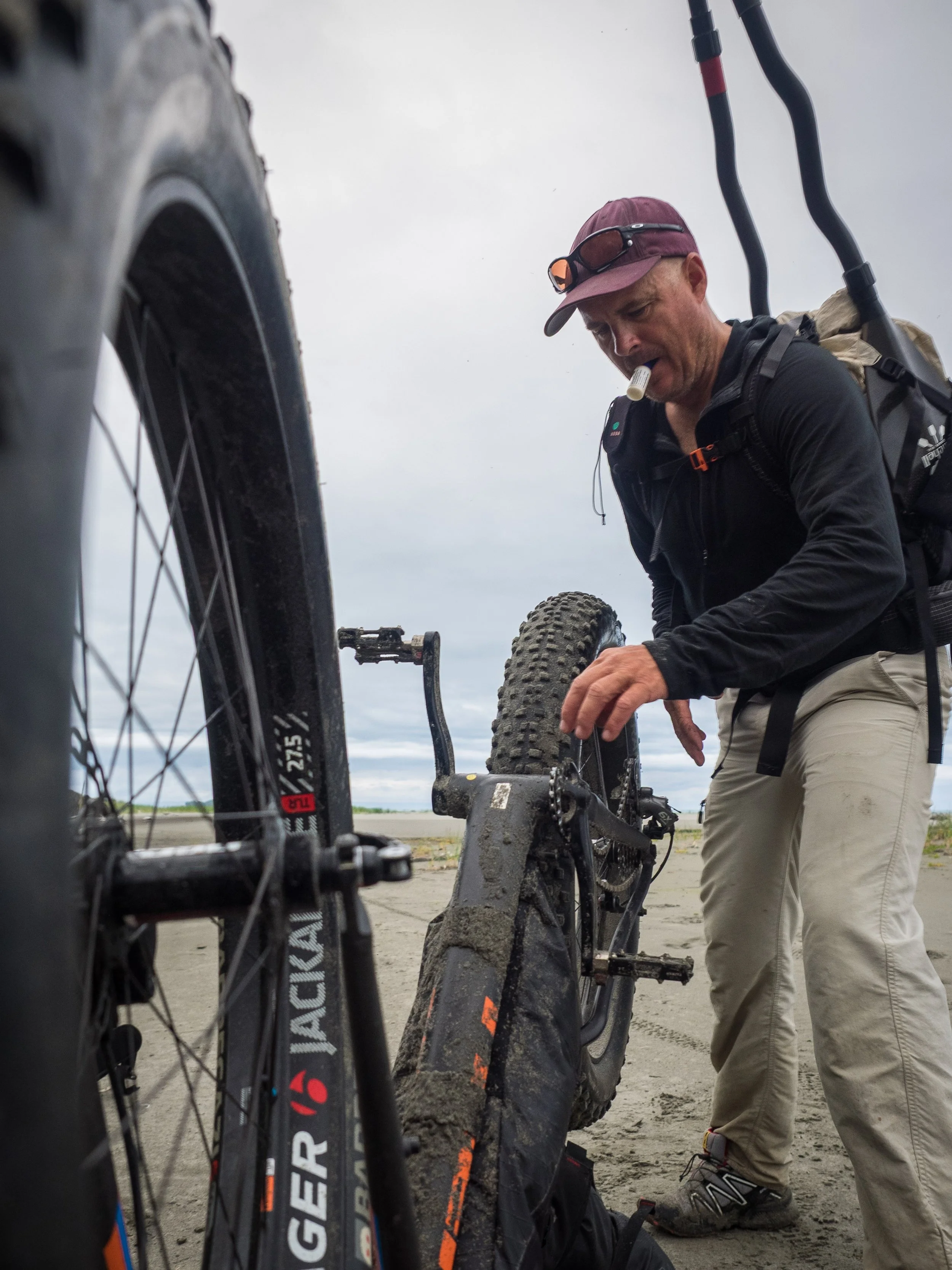 After what seemed like an eternity, I pedaled to the edge of a deep channel of water which was the final obstacle separating us from reaching the high ground of the mainland. We would have to inflate our rafts to overcome this final challenge. Laying my bike on its side, I quickly removed my pack raft from its place on the Anything Cradle and began inflating it. Within 30 seconds, my bike, which had been dry, was now beginning to float from the incoming waters. With a renewed sense of urgency, I captured and squeezed air into my raft. Looking behind me, I saw the others stopping to inflate their rafts as well. Roman was just a silhouette on the horizon, still pedaling. He was going to have a bit of a paddle. With my raft mostly inflated, I recovered my bike and balanced it across the raft for my final disaster style crossing of the day. Wahoo! Controller Bay was crossed. The reward for our efforts was a stunning coast line of vibrant lupine, fireweed, and raspberries. The smell of the flowers was as intoxicating as the myriad of colors dancing across the horizon. What a day!