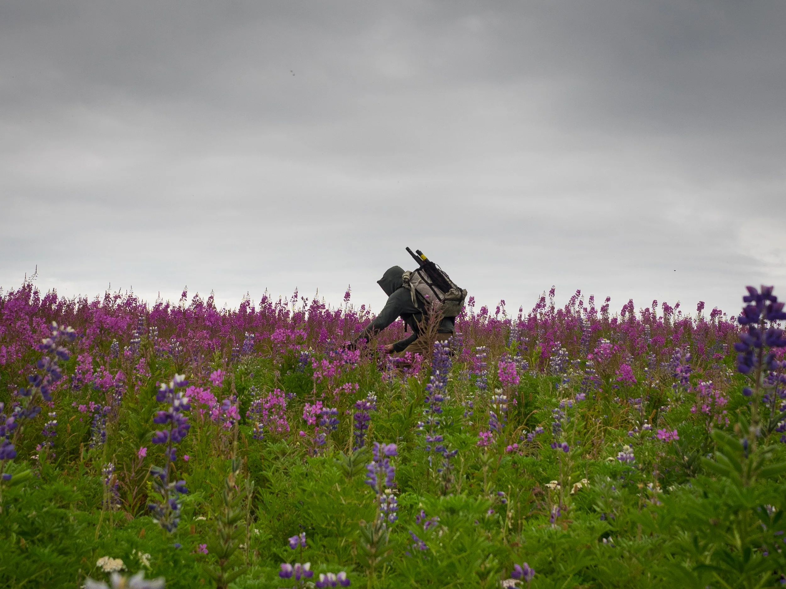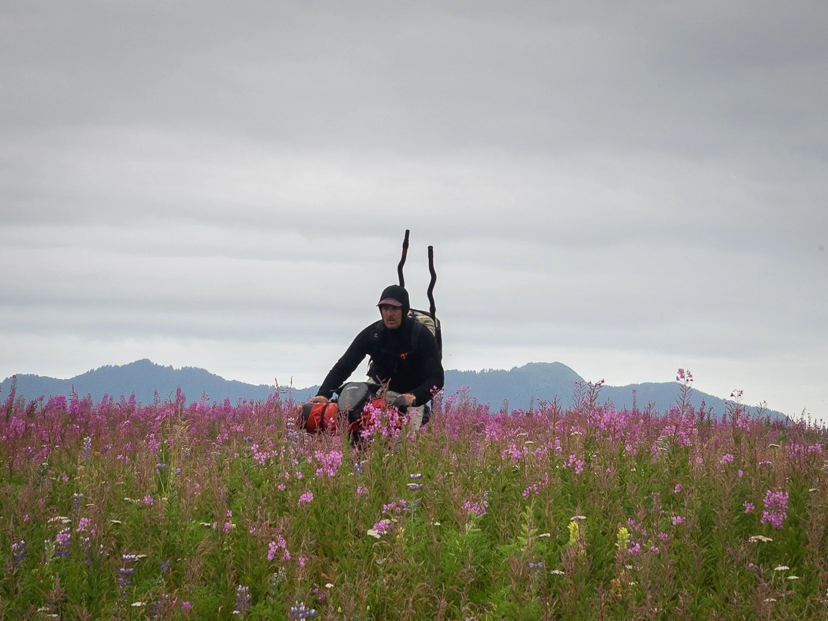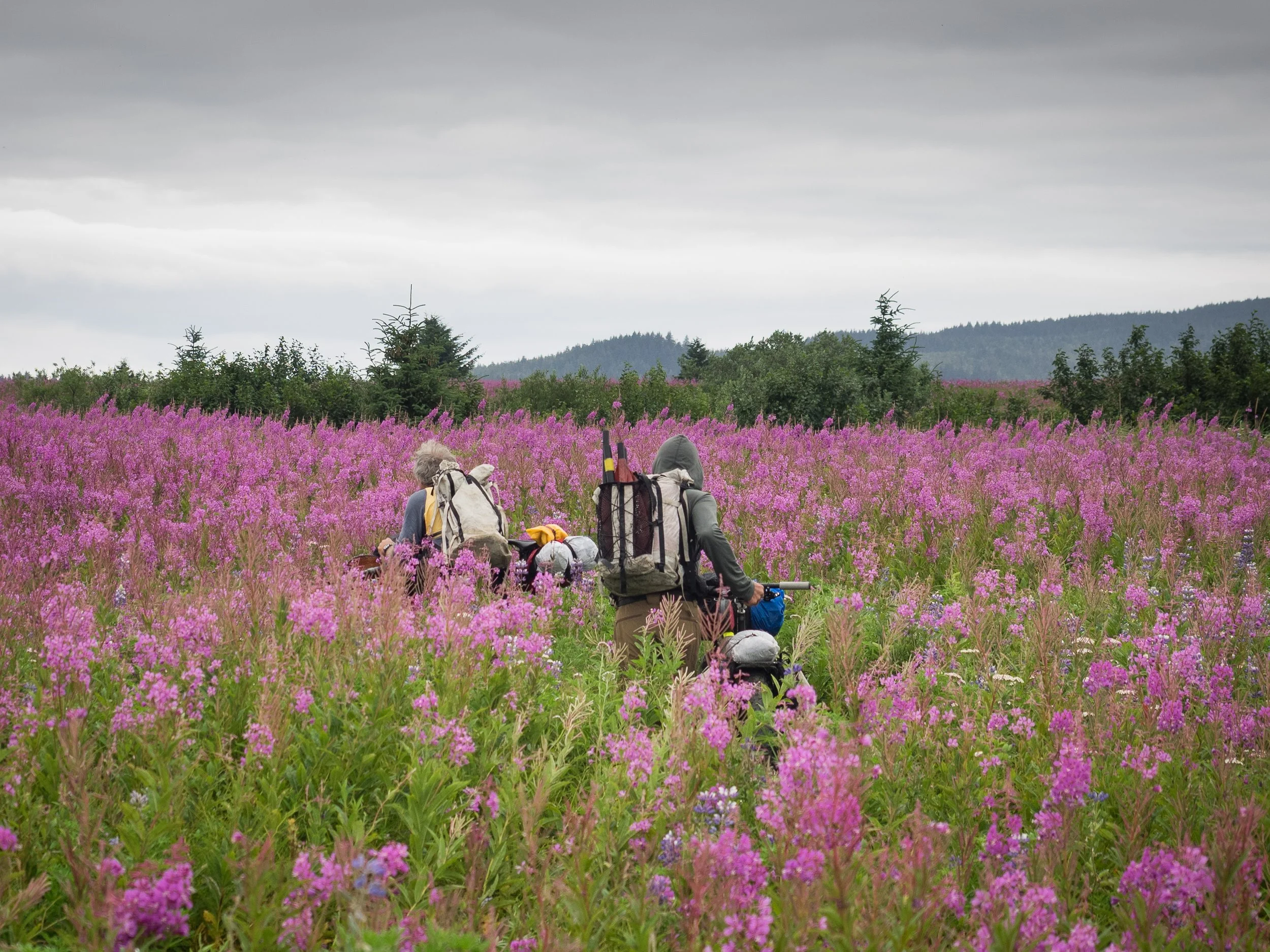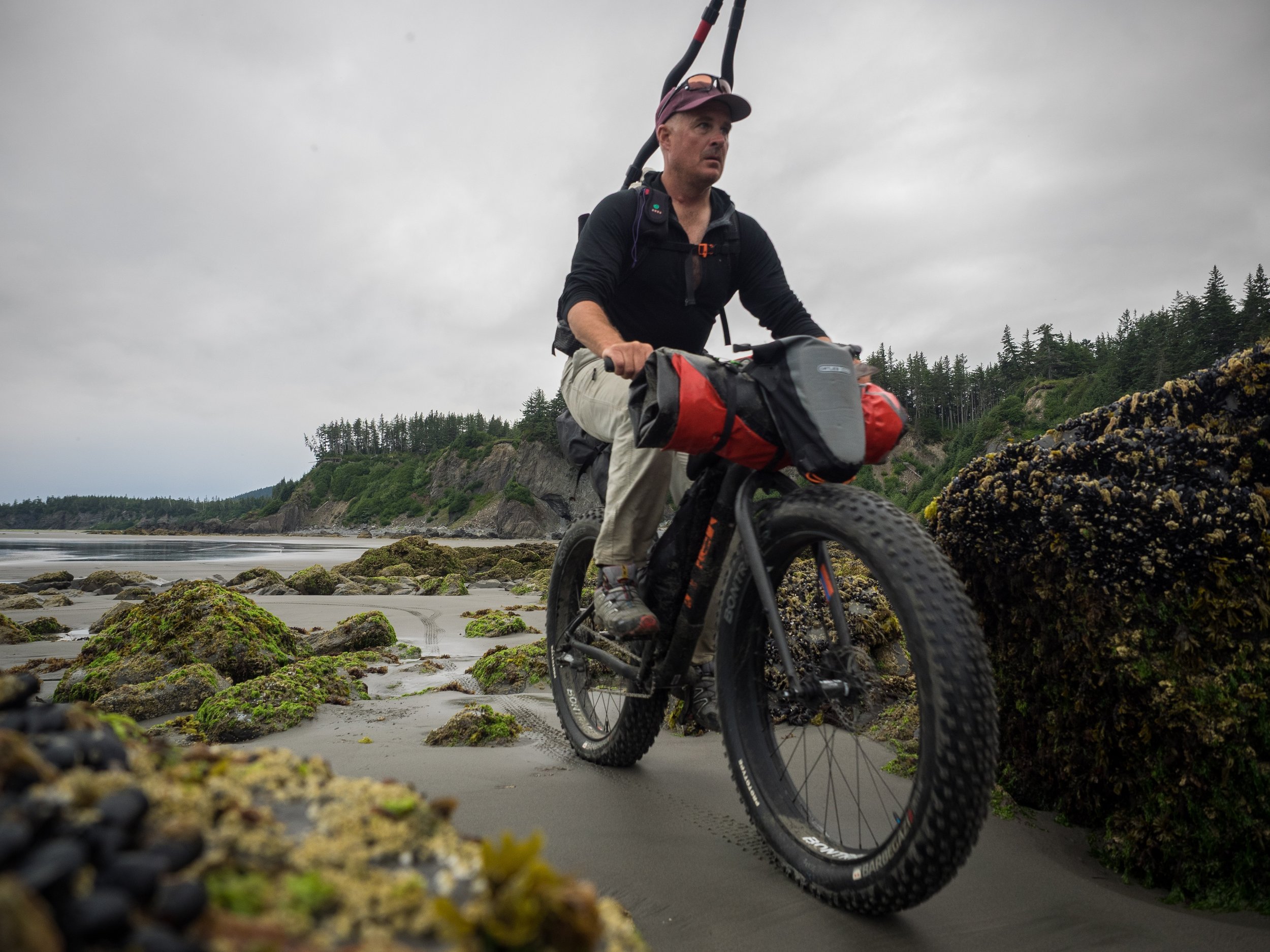 After what seemed like an eternity, I pedaled to the edge of a deep channel of water which was the final obstacle separating us from reaching the high ground of the mainland. We would have to inflate our rafts to overcome this final challenge. Laying my bike on its side, I quickly removed my pack raft from its place on the Anything Cradle and began inflating it. Within 30 seconds, my bike, which had been dry, was now beginning to float from the incoming waters. With a renewed sense of urgency, I captured and squeezed air into my raft. Looking behind me, I saw the others stopping to inflate their rafts as well. Roman was just a silhouette on the horizon, still pedaling. He was going to have a bit of a paddle. With my raft mostly inflated, I recovered my bike and balanced it across the raft for my final disaster style crossing of the day. Wahoo! Controller Bay was crossed. The reward for our efforts was a stunning coast line of vibrant lupine, fireweed, and raspberries. The smell of the flowers was as intoxicating as the myriad of colors dancing across the horizon. What a day!