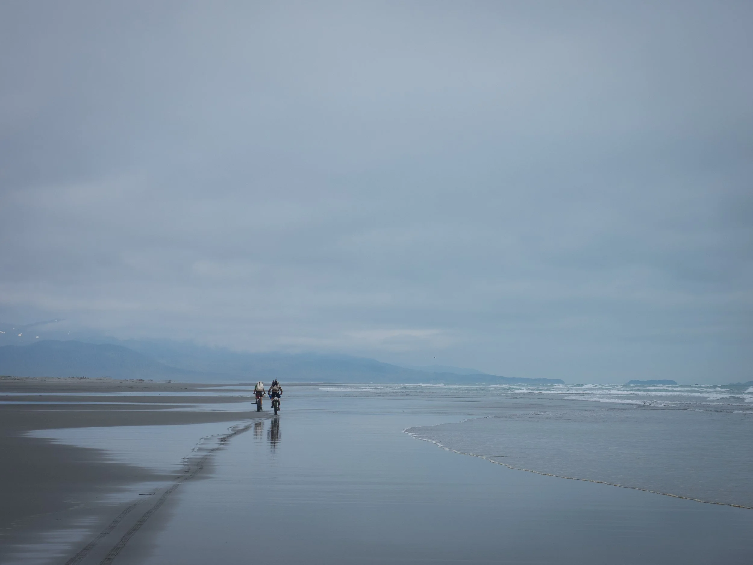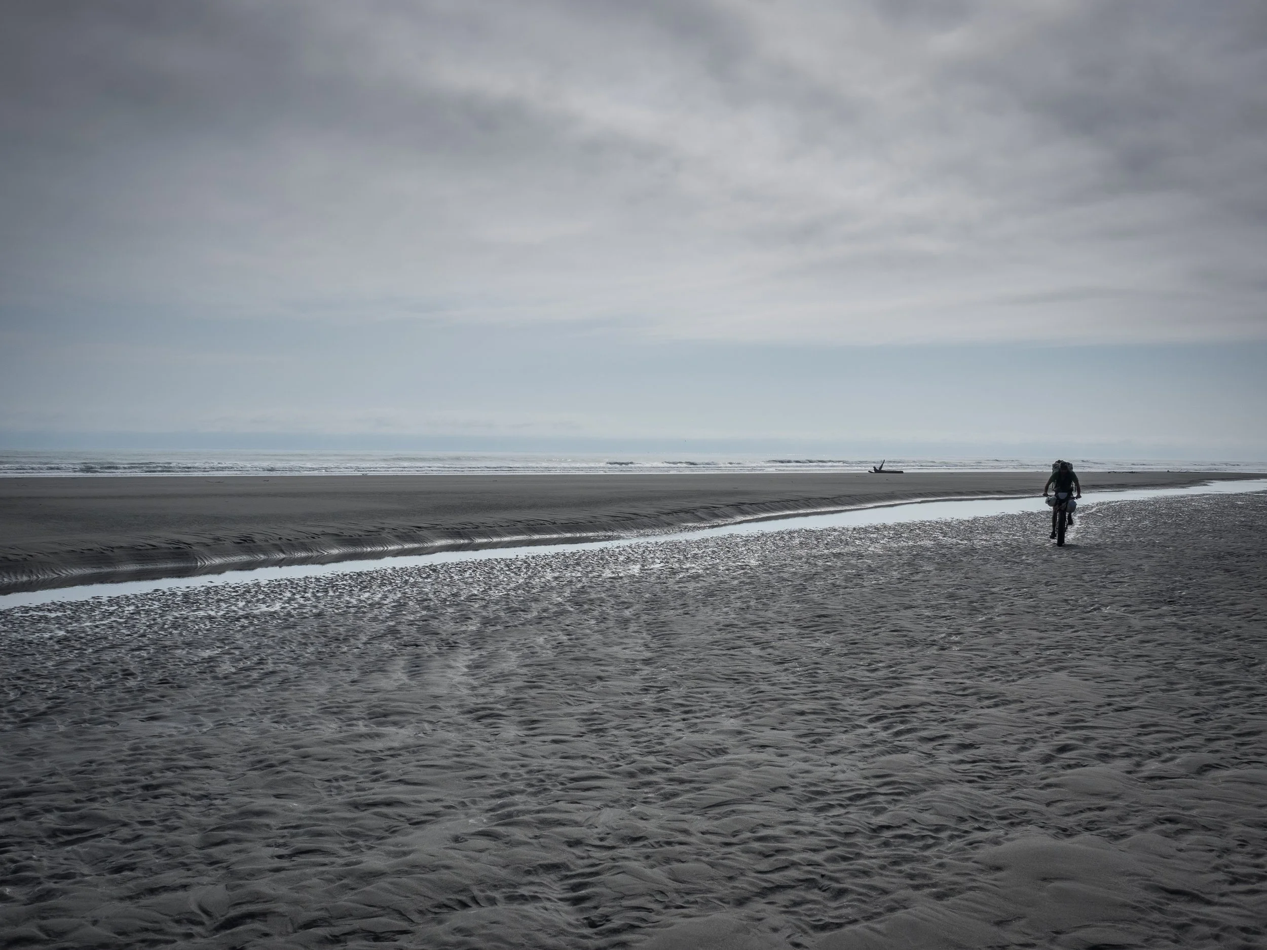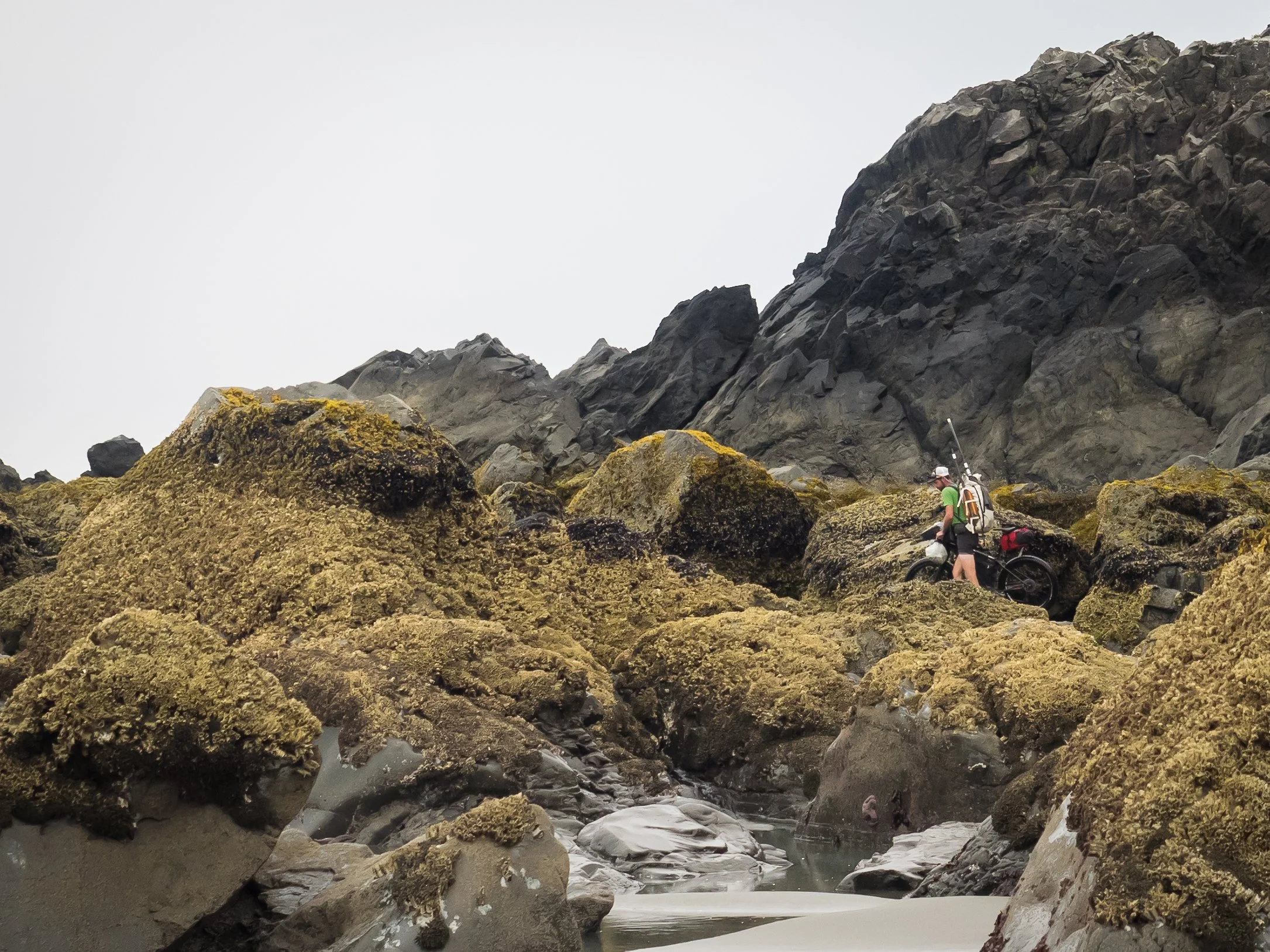 Awaking warm and dry on day three in a forest service hut, we packed quickly and were on our way by 6:30 AM. Seeking the advantage provided by a low tide, we made our way uneventfully around Cape Martin. Bouncing our bikes through the slick kelp covered boulders of the cape we made good time. Our sand continued to be supportable, allowing us to cover ground quickly. Additionally, our weather was still hospitable with the grey skies void of precipitation.