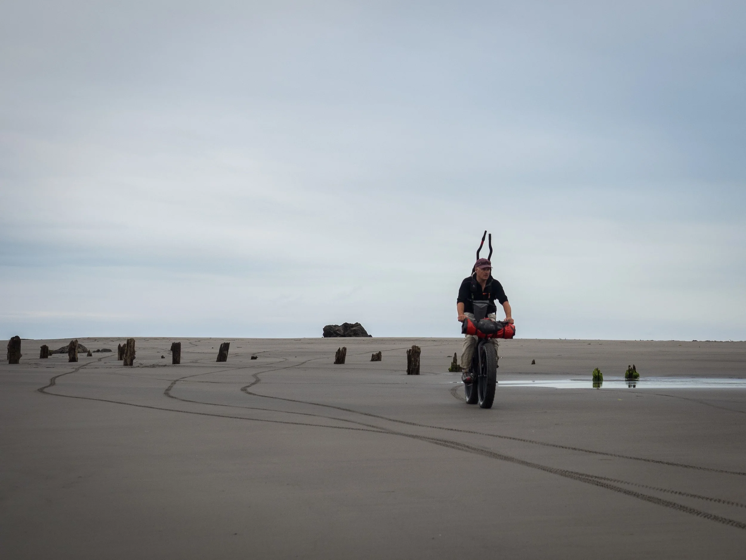 Upon reaching the coast, I reveled in the ability to pedal once again. My dream of riding a fat bike along a coast was now a reality. It was exhilarating to be leaving my tracks in the sand. And oh, how easy it was to ride. Our weather was holding with the deep fog lifting ever so slightly to reveal the discernable high peaks which make up the rugged coast of southeast Alaska. Out ahead of us was a wild land of endless adventure. In 2008, Eric Parsons and Dylan Kentch pioneered the route we were currently following. They had traversed the 290 miles in reverse, beginning in the small town of Yakutat and ending 20 days later at our starting point in Cordova. They encountered and were subjected to torturous weather and a brutal landscape of impenetrable thickets of vegetation; rocky headlands; endless miles of ever changing sand; and precarious crossings of glacial rivers and tumultuous open bays. We were aiming to duplicate their journey in a mere 11 days.
