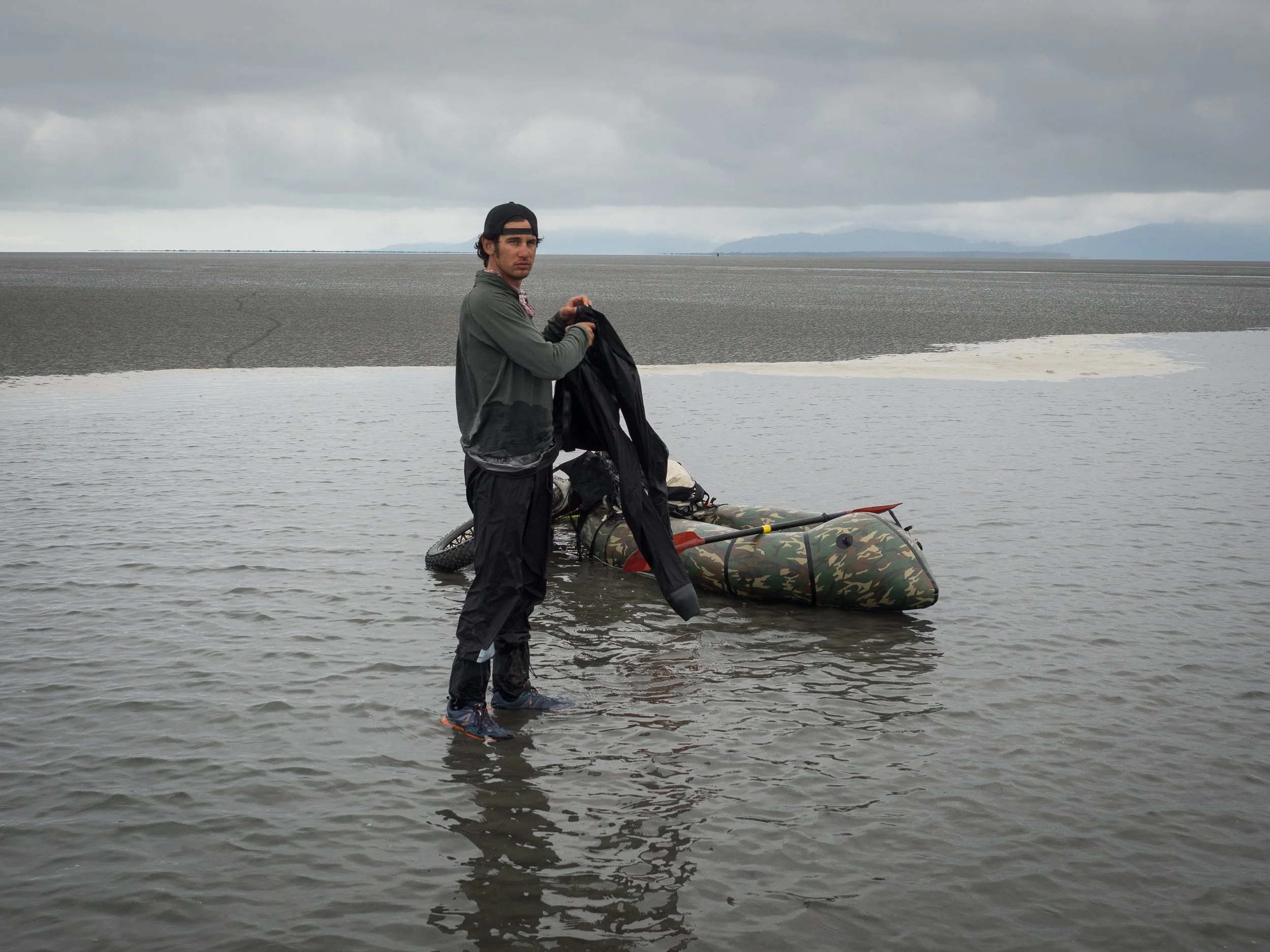 Our first big crossing was Controller Bay. Eric and Dylan had found it to be a rowdy endeavor. We came upon the mouth of the bay at low tide. The horizon was dotted with sand bars separating channels of deep water. As I contemplated what lied ahead, I watched Roman, Mike and Doom inflate their pack rafts and plop their bikes across the bows of their rafts. In the blink of an eye they were paddling across the short stretches of water with their unsecured bikes balanced precariously. A slight shift of weight from an unexpected gust of wind or body movement could result in a sudden capsize with both person and bike floating in the sea water. Following suit, I tried my hand at this “disaster” style technique as was coined by my fellow crew members.