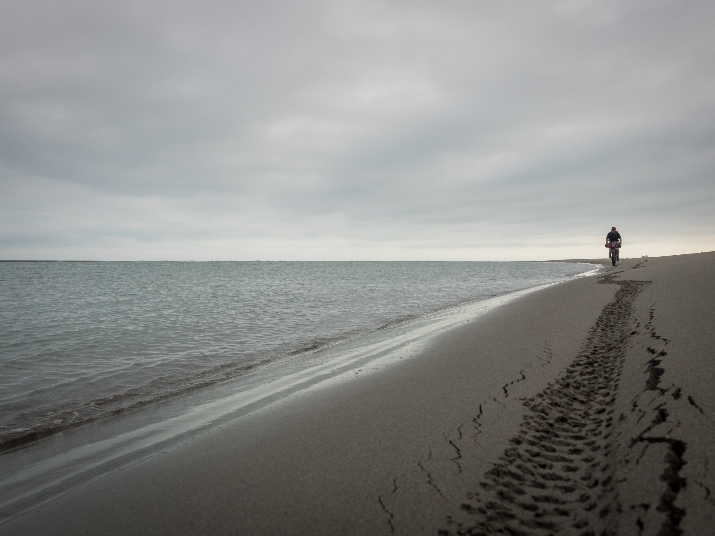 Once landing on the island, we stood up from our low perches in the rafts to look at the bay beyond. To our surprise, the bay was a vast plain of sand flats dotted with pools of water. Our tide was still out, but coming in quickly. Deflating and stowing our rafts, we began the race against the clock to pedal the final miles to the mainland before the rising waters caught us in the middle of the bay. Absorbed in our thoughts of what would happen if the tide caught us short of the coast, we cranked on our pedals with a tenacity brought on by purpose. As I stared across the glimmering pools of water and sand to the thin veil of green on the horizon, I willed the bike forward hoping the far off landmark would quickly grow in size.