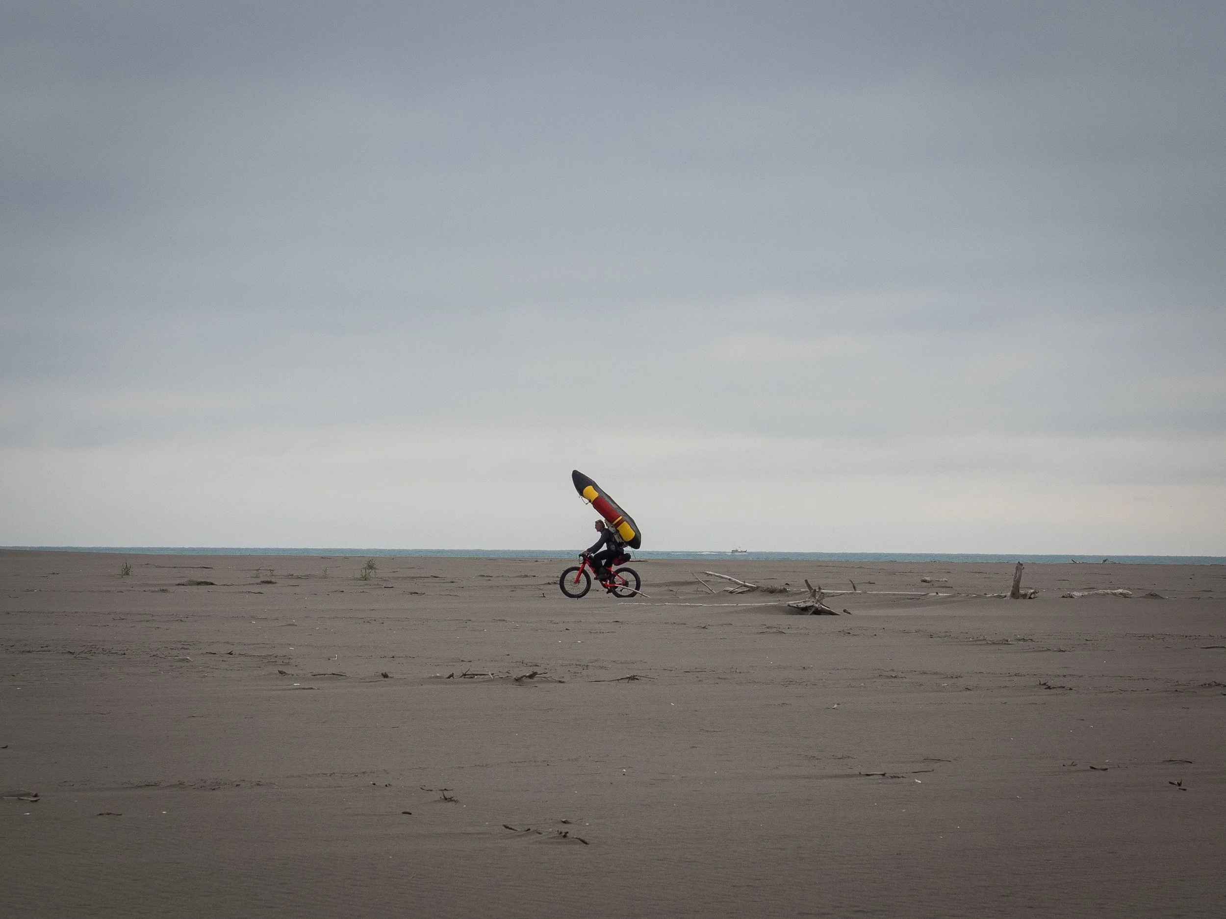 Having strapped his pack to the bow of his raft, once on the other side of a channel, Roman would put his pack on with his pack raft sticking straight up in the air and remount his bike to ride to the next crossing. Adapting to his style, we quickly made our way into Controller Bay, paddling from one sand bar to the next. After several disaster style crossings, we came to a channel that was too expansive to safely cross without a little bit more security. Removing the front wheels of our bikes to allow for more extension in our paddle strokes, we strapped the bikes to the rafts and commenced the half mile paddle to what was indicated on our map as Kanak Island. We were nearly half way across Controller Bay, and the going had been easy thus far.